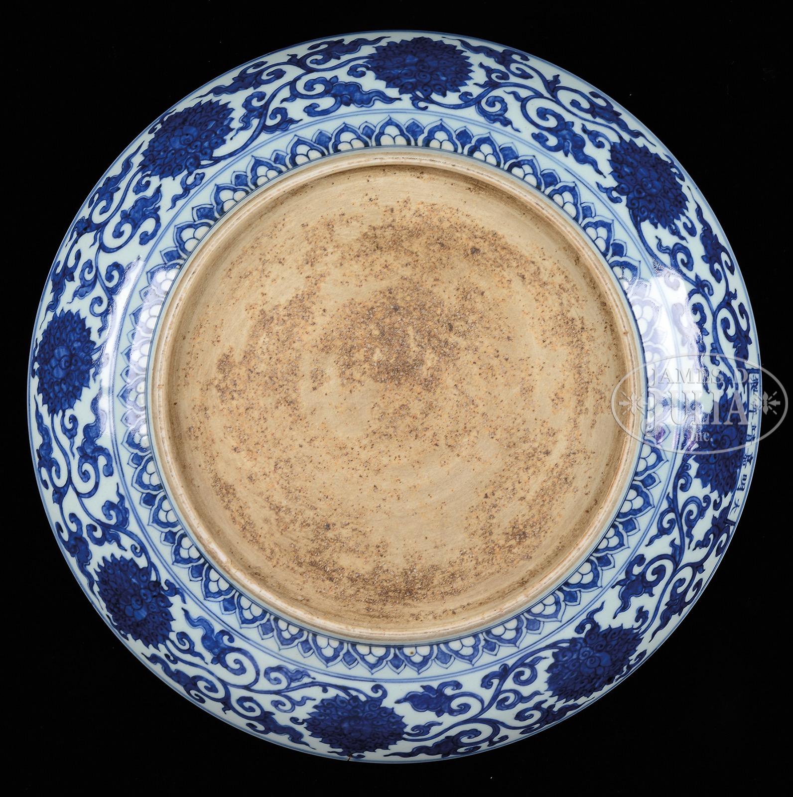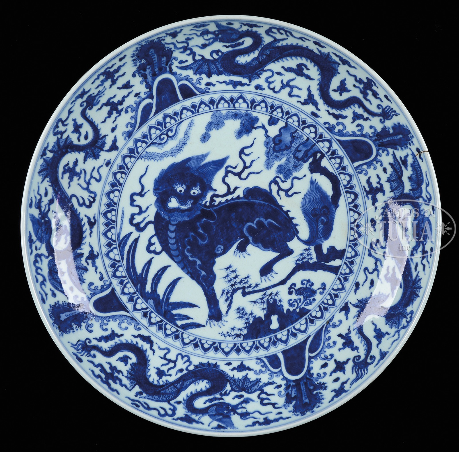 BLUE AND WHITE PORCELAIN CHARGER.China, 20th century. The charger decorated in under glaze blue with a central reserve containing a mythical creature surrounded by dragons in flight. The edge of the rim with a six character Jiajing mark. SIZE: 19-1/2″ dia. CONDITION: Very good, one firing line on the rim. 50934-6 (600-800) – Lot 1645