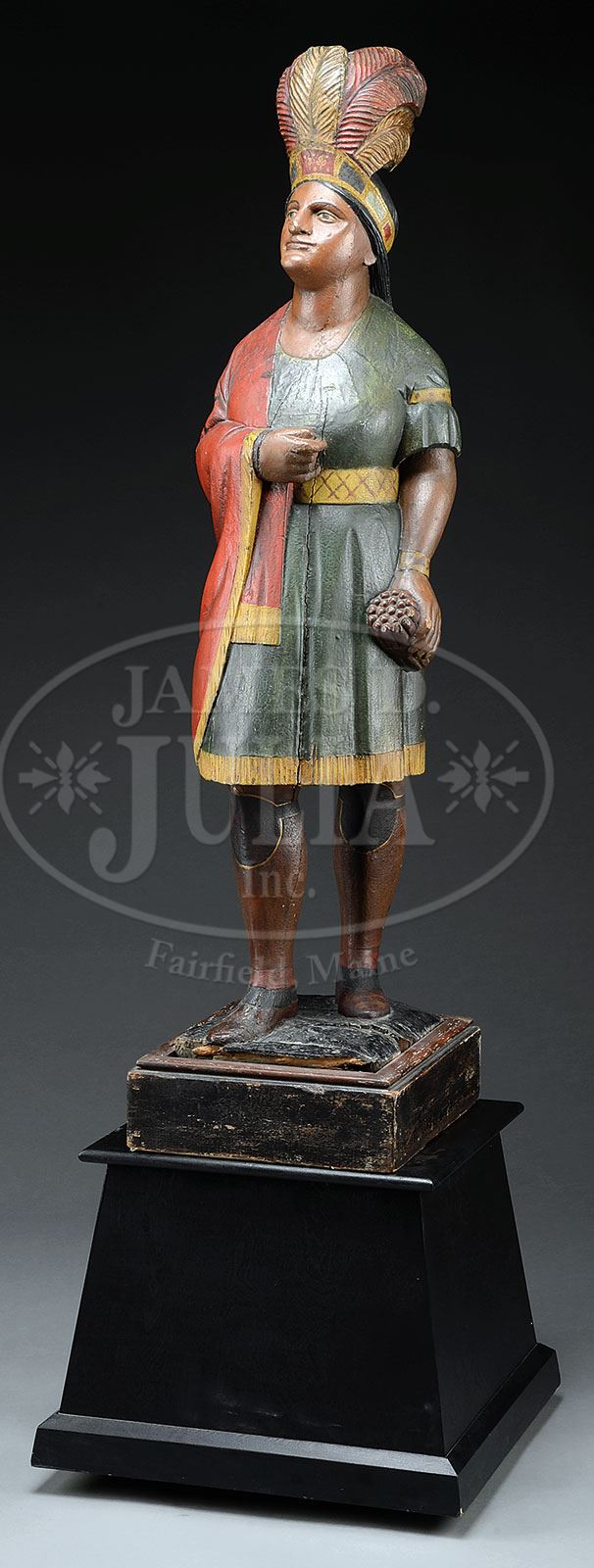 As clearly noted in the catalog image, the figure has some drying splits that are natural and expected to be found in a genuine old figure such as this. FINE CARVED & PAINTED TOBACCONIST FIGURE ATTRIBUTED TO SAMUEL ROBB.Late 19th century. Carved from the solid depicting a Native American dressed in robe and tunic with feather headdress, holding a cluster of cigars in left hand. Carved on a square plinth, mounted on a wood frame. SIZE: 54-1/2″ h x 13″ d. PROVENANCE: The Collection of Richard J. Miller. CONDITION: Structurally very good. Polychrome painted surfaces appear old if not original with normal expected cracquelure and good patina. 1-14987 (6,000-8,000) – Lot 1646a Auction: Advertising, Toy & Doll Auction - Fall 2014 Please Note: All prices include the hammer price plus the buyer’s premium, which is paid by the buyer as part of the purchase price. The prices noted here after the auction are considered unofficial and do not become official until after the 46th day. |