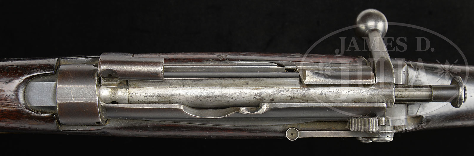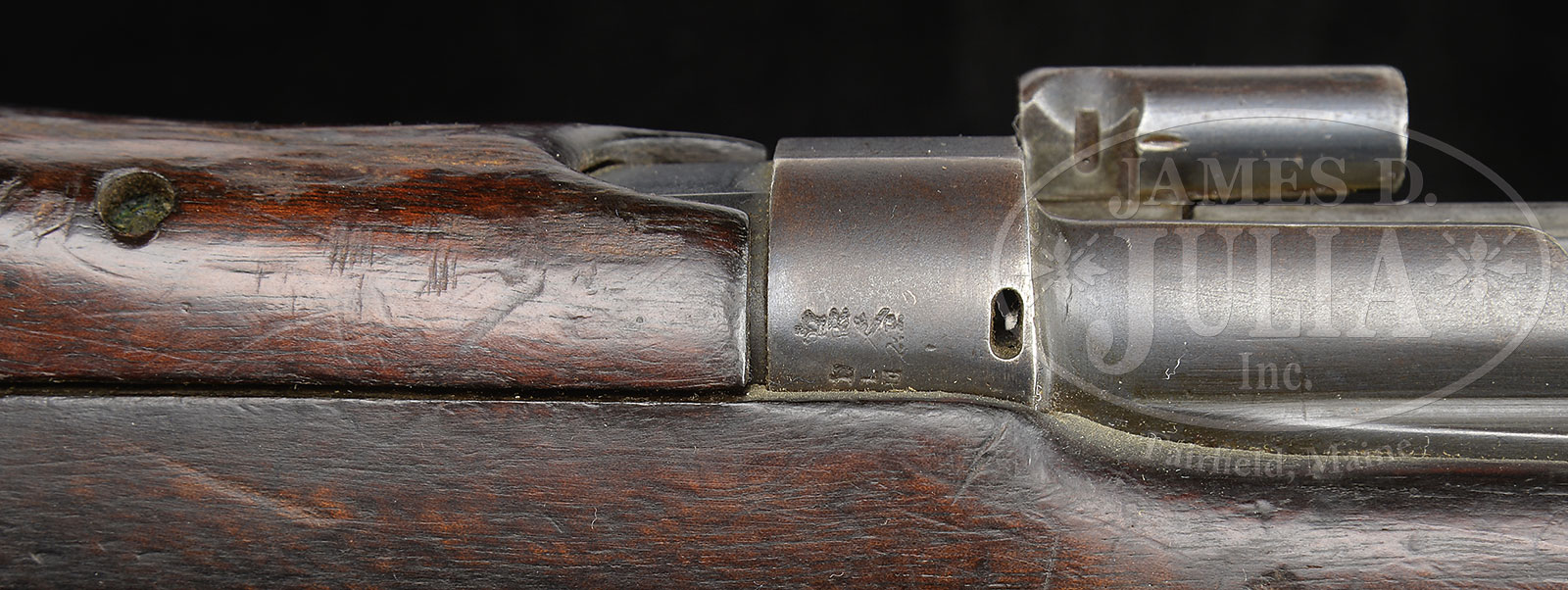 *SOLE KNOWN SURVIVING SPECIMEN BRITISH R.S.A.F. ENFIELD .303 SMLE 1902 TROOP TRIALS MODEL A PATTERN RIFLE.SN B156. Cal. 303. British. 25.2″ bbl. Described in Ian’s Skennerton’s reference book The Lee Enfield, pg 460 this is the only known surviving specimen of the A pattern troop trials rifle from 1902 which were made in 1901. It has a special rear sight protector on hand guard, a blade front sight with bead, fully enclosed front sight protector, and special buttplate. 1-pc hand guard with protector wings make this rifle immediately recognizable. There is a white band of paint on the butt with initials “WB”. This is intended to indicate to armorers this rifle has non-interchangeable parts. Butt is marked with solitary “S”. No markings, only proofs and SNs. Matching receiver, bolt, bbl, sight, nosecap and forend. Rear sight graduated to 2000 yards; dial sight plate from 1600 to 2800 yards. Robust black leather sling included. PROVENANCE: From the Estate of World Renowned British Rifle Collector Robert W. Faris. CONDITION: Overall appearance and finish extremely fine. Orig blue on metal parts starting to turn a pleasing brown patina with wear to the high edges, somewhat thinner finish and brown patina on magazine. Buttplate exhibits several small dings. Bore has strong rifling turning dark in the grooves. Wood is very good to fine with numerous dents, dings and gouges, but remains completely serviceable. This A pattern rifle together with the B pattern also offered in this auction are the only known survivors of 1,055 specimens made in 1901. They will become the great pride of whichever discerning and advanced collector is fortunate enough to acquire them. 51608-1 JWK (15,000-20,000) C&R – Lot 1647