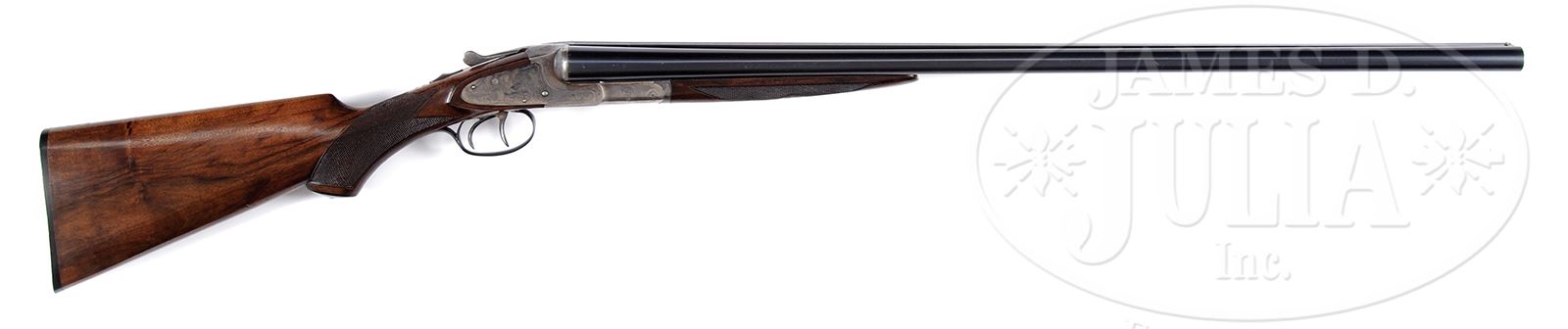 *SCARCE L.C. SMITH GRADE 2.SN 324783. Cal. 12 Ga. 30″ fluid steel bbls. 2-3/4″ chambers. Choked: FULL/IMP MOD. Full length matted rib with brass front bead, marked “HUNTER ARMS CO. FULTON, NY”. Double triggers, extractors, automatic safety. Nicely figured walnut buttstock is capped full pistol grip with 14-1/2″ LOP over black serrated hard rubber buttplate. Splinter forearm with dog’s head ebony escutcheon and triangular ebony tip, checkered in 3-point pattern. Buttstock checkered in classic 2-point pattern. Receiver lightly scroll engraved in classic Grade 2 pattern with quail on both right and left sides. Bottom of receiver lightly scroll engraved. Trigger guard with a burst of scroll at bow and tang. Weight: 7 lb 13 oz. PROVENANCE: The Estate of B.E. “Andy” Anderson. CONDITION: Excellent, as partially refurbished. Bbls retain 95-98% orig bbl blue with a few light handling marks throughout. Receiver retains 70-75% nice orig case color, toned on bottom. Trigger guard retains nearly all of a refurbished blued finish. Buttstock and forearm retain nearly all of their fine orig finish with a few light scratches and handling marks throughout. Mechanics are excellent. Brilliant shiny bores. A lovely high conditioned Grade 2. 49531-30 JSL148 C&R (1,250-2,250) – Lot 1649