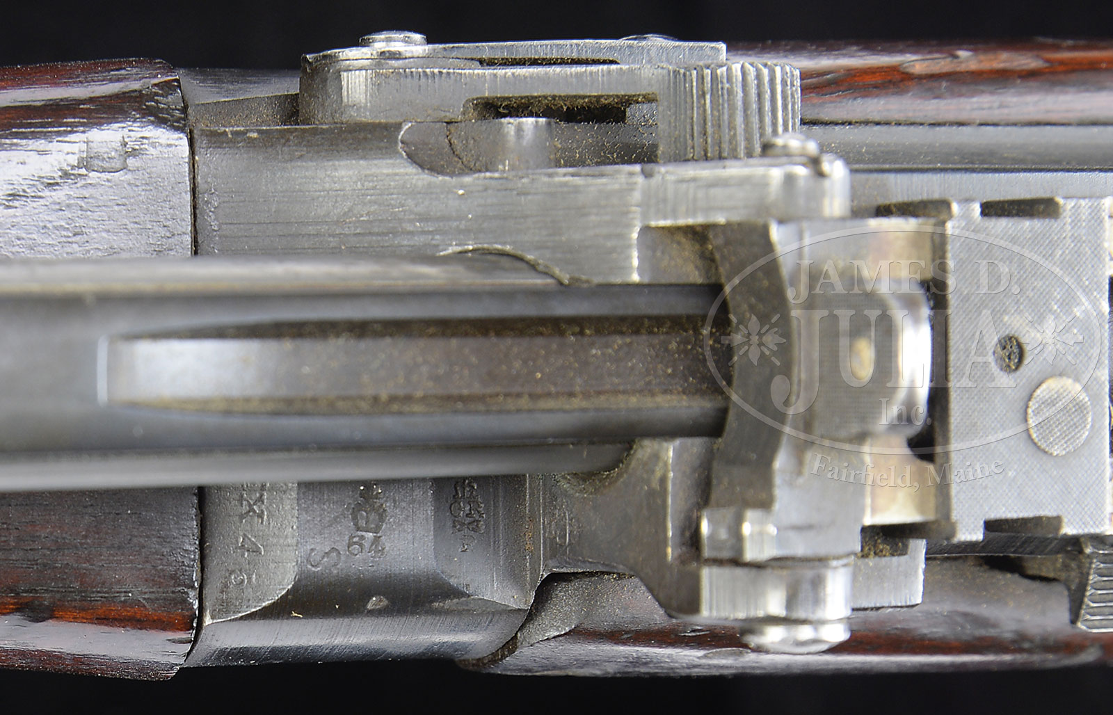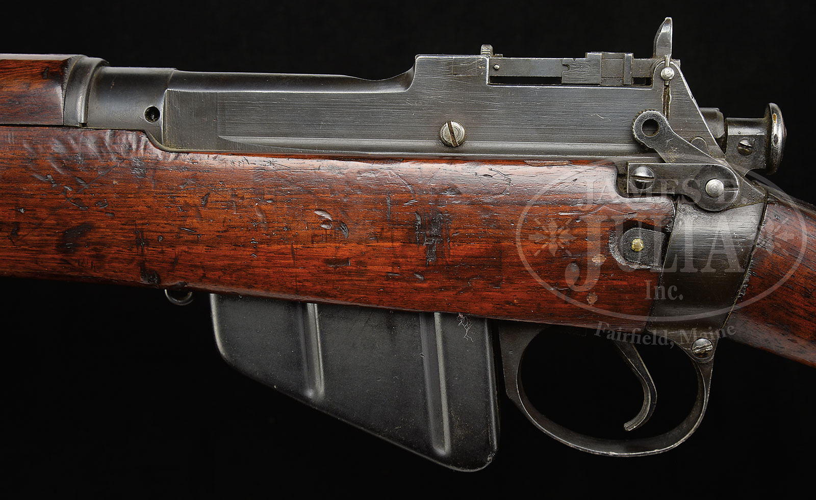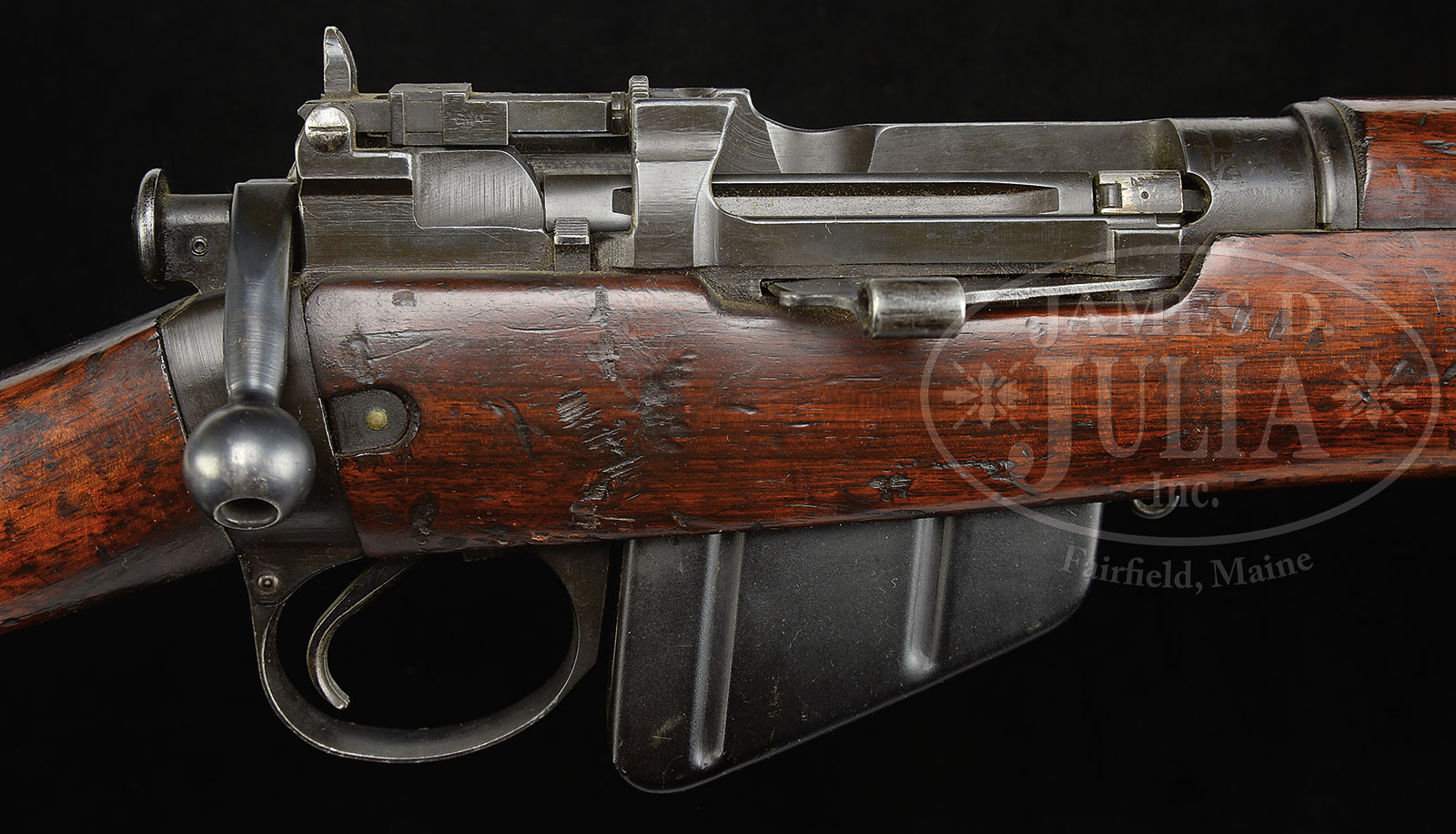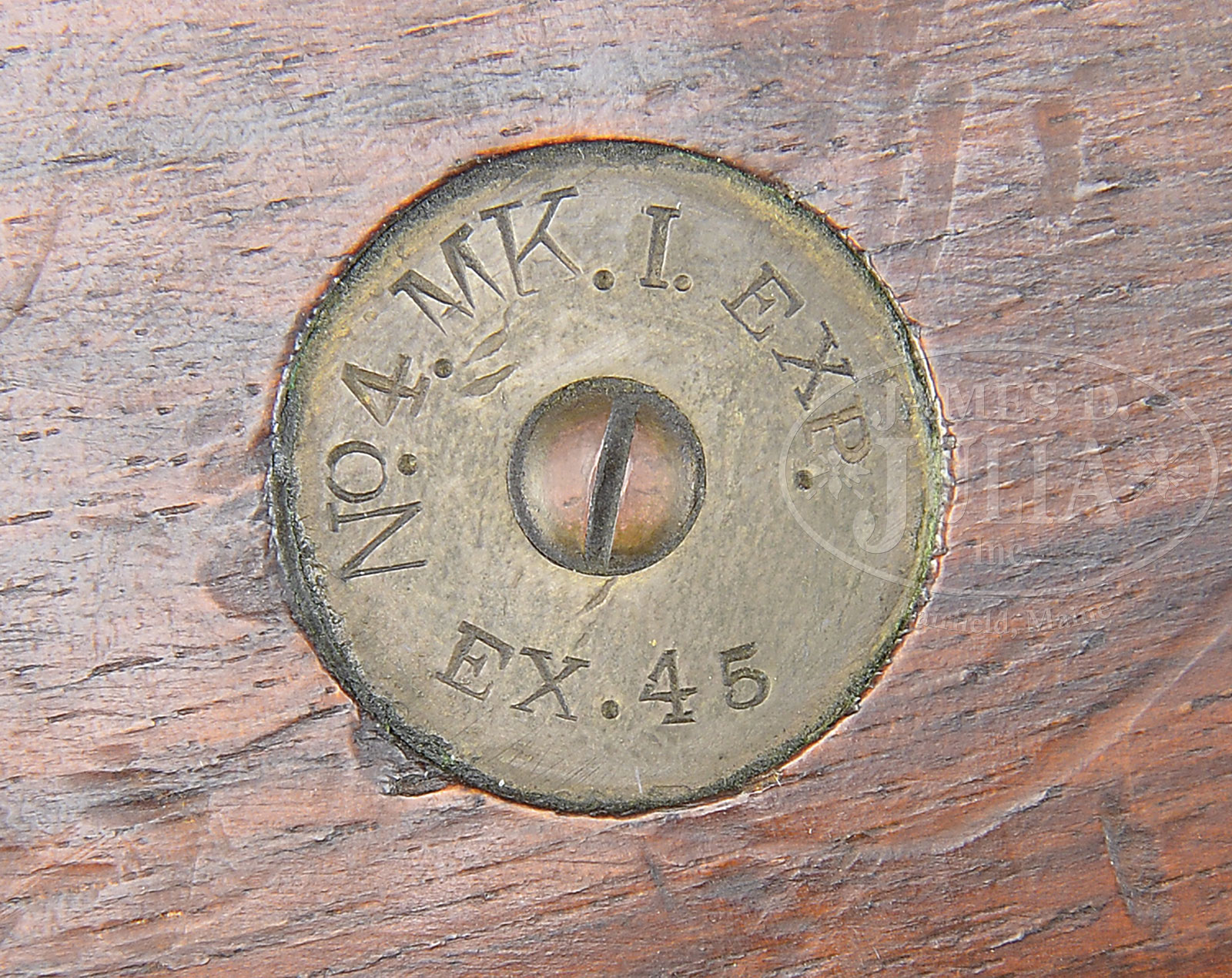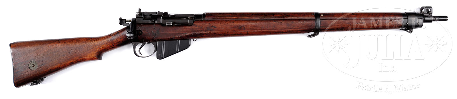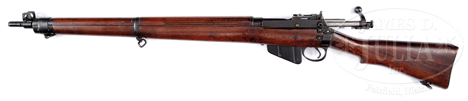 *FANTASTIC BRITISH R.S.A.F. ENFIELD .303 SMLE NO. 4 MK I PRE-PRODUCTION TRIALS RIFLE.SN EX45. Cal. .303. British. 25.2″ bbl. This rifle is described in Skennerton’s reference, pg 221, the pre-production trials No. 4 rifle manufactured between 1930-1931. It is immediately recognizable from the fabricated magazine cut off and also exhibits a transverse screw in rounded button cocking piece. Also incorporates a waisted sight protector. Typical small sling swivel. SN visible on top of receiver behind bolt handle and also on top of front bbl band. Grooved hand guard. Formerly in the Kenyan Royal Military Academy Museum, the museum catalog number “P19” is at toe of the butt. Marked with British nitro proofs on bbl and top of receiver band. Bbl is date “30”. Brass buttplate and butt disc marked “No IV. MK. I. EXP.” with SN “EXP. 45”. One of its mates is in the Pattern Room Collection in England. PROVENANCE: From the Estate of World Renowned British Rifle Collector Robert W. Faris. CONDITION: Extremely fine to near excellent orig blued finish on metal parts. Thinning at the outer edge of the magazine cut off and along high edges at top of front sight and forward most sling band. Brass buttplate a pleasing dark patina. Bore is near excellent, shiny and bright. Wood is also extremely fine with numerous minor dings and bruises, yet still very attractive. 51608-16 JWK (10,000-15,000) C&R – Lot 1649