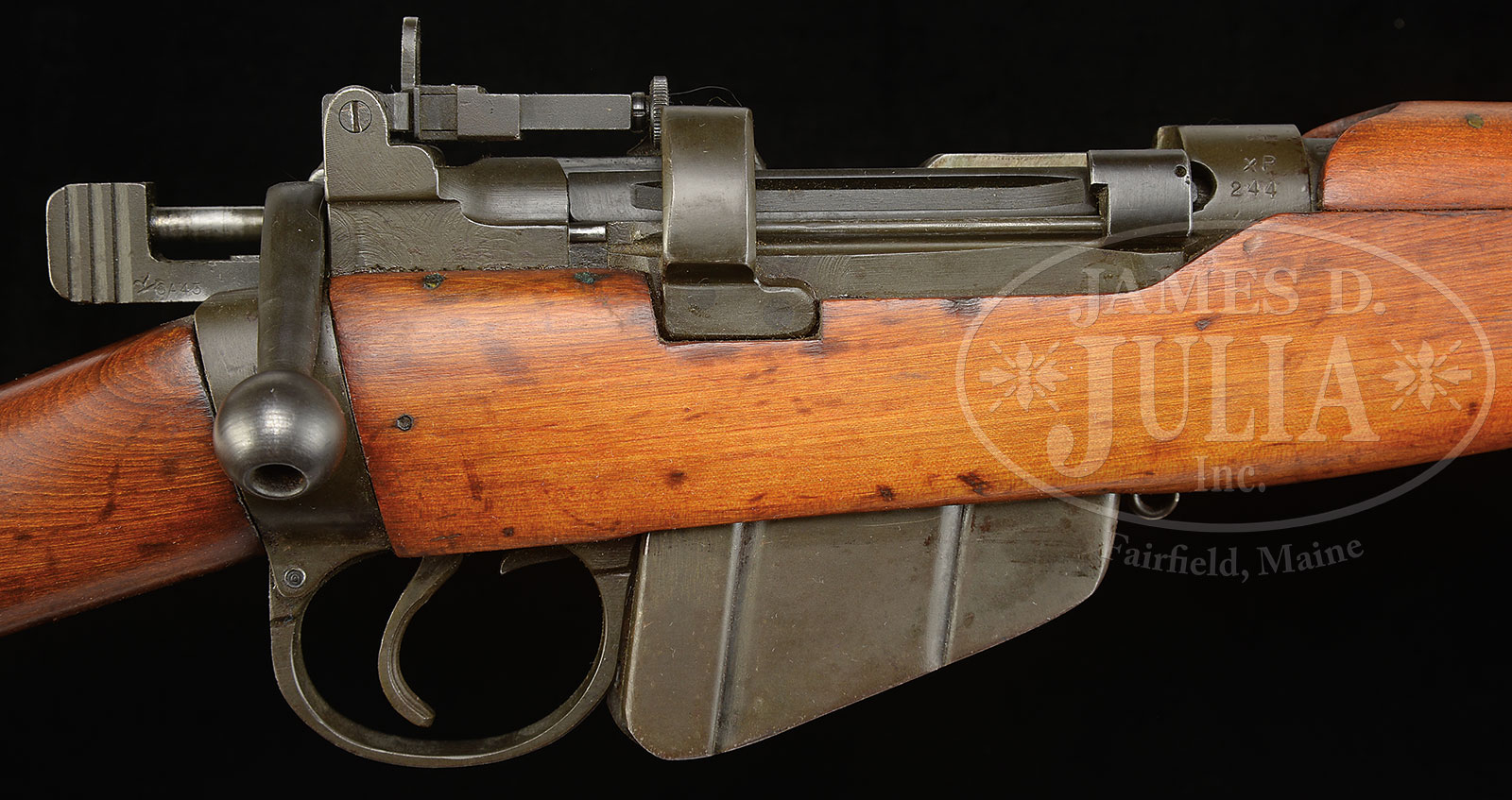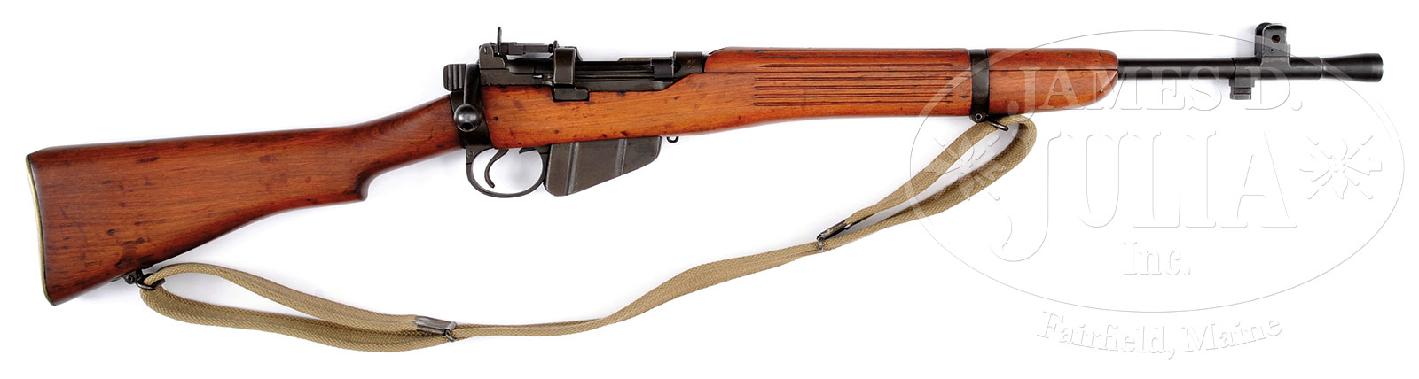 *RARE LITHGOW (AUSTRALIAN) .303 RIFLE NO. 6 MK I TROOP TRIALS CARBINE.SN XP244. Cal. .303 British. Very rare troop trials carbine as described in Ian’s Skennerton’s reference book The Lee Enfield, pgs 349 & 502 with grooved stock and hand guard, recessed hole in bolt handle knob, brass buttplate, narrow trigger guard and charger bridge with SMLE body casting modified for rear aperture sight. Savage marked slide and adjustment screw on rear sight. Also has thinner, shaved butt, Bren gun style sheet metal front sight protector ears and squared bayonet lug. US import mark on bbl under hand guard. Included is a fine orig 1944 dated web sling. All matching numbers between receiver and bolt. PROVENANCE: From the Estate of World Renowned British Rifle Collector Robert W. Faris. CONDITION: Overall appearance and finish near excellent. Orig blued finish with some wear at the rear sight attachment points and at high edges of magazine. Bright shiny bore with some frosting on the lands. Wooden stock very attractive with some scattered handling marks. There were only 100 of these troop trials guns made and only 50 with a regular brass buttplate. 51608-6 JWK (10,000-20,000) C&R – Lot 1652