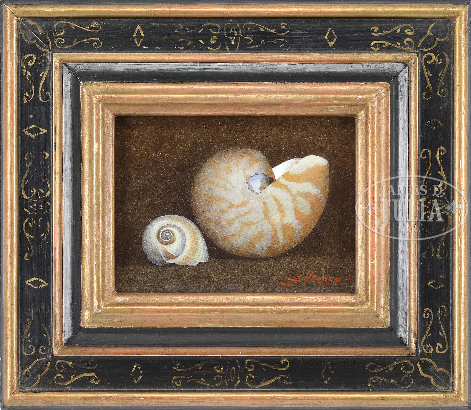 1) Elizabeth Wadleigh Leary “Nautilus & Moon Shell” Acrylic on panel Housed in a fine decorative wood frame by Heydenryk, NY 2-6) Five decorative prints including two framed French children prints; Dragonfly housed in a very nice frame & mat; “Two Royal Elephants” of a piece contained Pierpont Morgan Library; Gordon Grant “Old Ironsides” SIZE: 1) 5-1/4″ x 7″. Overall: 10-3/4″ x 12-1/4″. 2-6) Overall: 9″ x 8″ to 17″ x 21″ PROVENANCE: From a private Massachusetts collection CONDITION: 1) Very good. 2-6) All very good with some frame losses, Grant has waterstains, as is 50800-27 (100-200) – Lot 1655