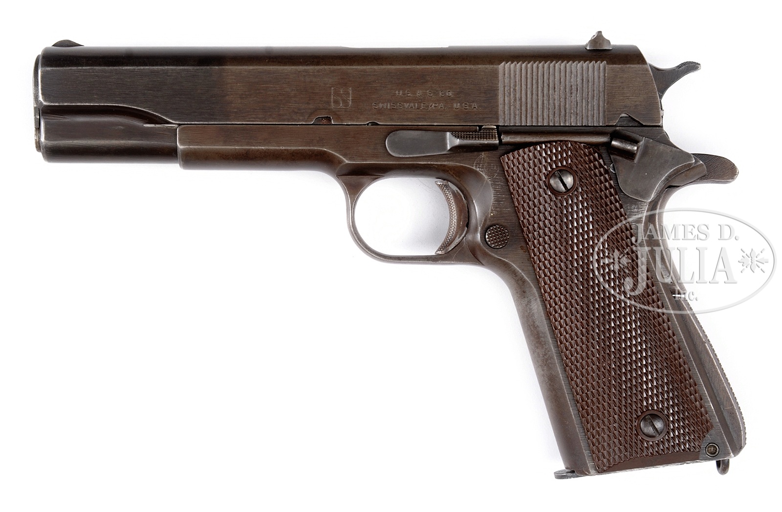*GOOD WORLD WAR II UNION SWITCH & SIGNAL MODEL 1911 A1 MANUFACTURED 1943.SN 1052008. Cal. 45 ACP. Traditional 5″ bbl. Parkerized finish overall. Left side of slide with the intertwined US&S logo and marked “US&S Co., Swissvale, PA, USA”. Right side of frame are traditional United States property markings with SN and “M 1911 A1 U.S. Property”. Left side of frame has the traditional “RCD” inside of a circle inspection (R.C. Downey). 2-pc narrow ring plastic grips manufactured by Keyes. Correct trigger, hammer, safeties and mainspring housing are present. Correct Springfield manufactured bbl and Scovill manufactured magazine. PROVENANCE: Gerard Ruth Collection, ex Alex Chauffe SR. CONDITION: Good overall, with most exterior finish having turned plum. A materially correct Union Switch & Signal with excellent bore and mechanics. 51036-20 TDW (2,500-3,500) C&R – Lot 1657