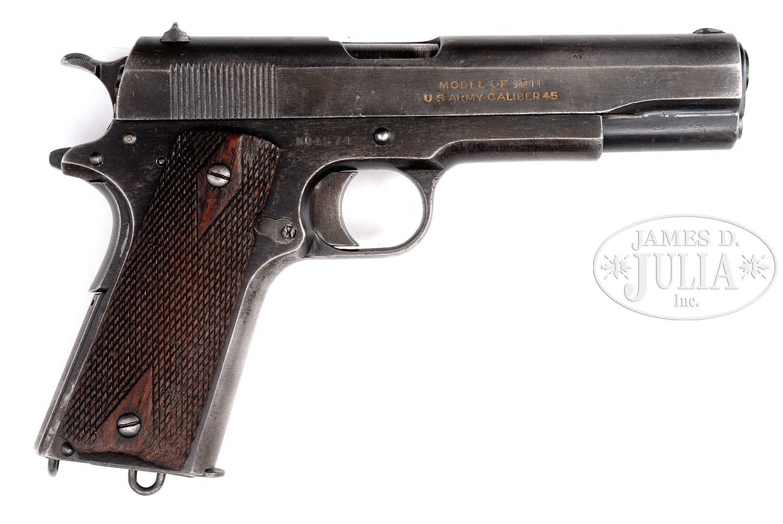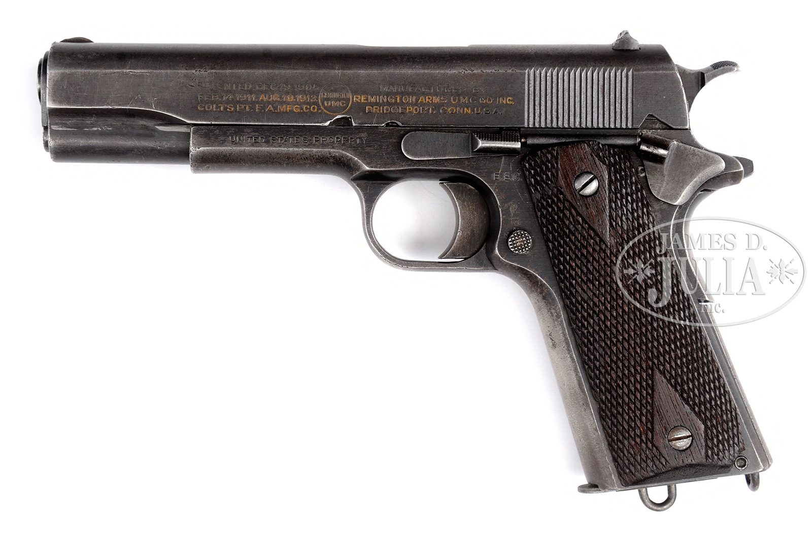SN 4574. Cal. 45 ACP. One of only 15,000 produced, the Remington UMC has always been one of the most sought after by 45 collectors. Left side of frame has a bold Remington UMC marking in circle with patent dates and address on both sides. Frame is marked “United States Property” with a strong “EEC” government inspector’s marking (Edward E. Chapman). Right side of slide marked “Model of 1911 U.S. Army Cal. 45”. Numbered on frame “NO.4574”. After detailed disassembly and inspection, very few faults were found. The only replacement part is a later Flannery- manufactured military bbl. Balance of parts are appropriate. PROVENANCE: Gerard Ruth Collection, ex Alex Chauffe SR. CONDITION: Much of the Remington brushed blue finish remains with evidence of period pitting on slide and very lightly on frame. Frame finish has worn silver on frontstraps and turned rather plum on backstrap. Finish is thinning on underside of frame and top and right side of slide. A very good example of the Remington UMC with nice lanyard loop period magazine. 51036-10 TDW (4,500-9,000) C&R – Lot 1660