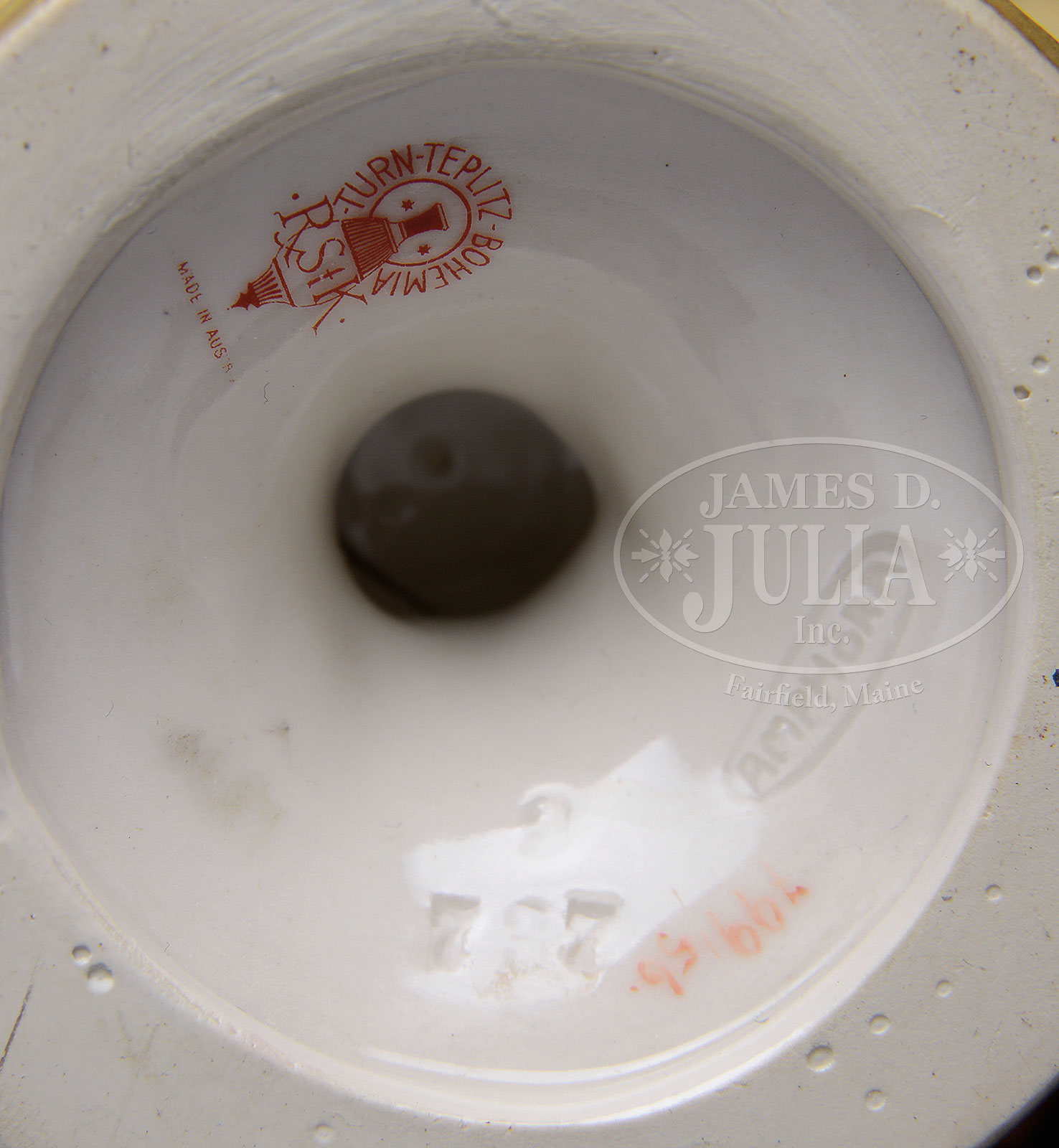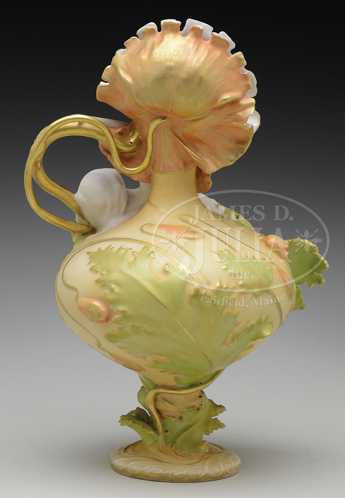 AMPHORA FEMME FLEUR FIGURAL VASE.Amphora figural vase with swirled wave pedestal foot is in the form of a reclining maiden holding gilded stems while emerging from green floral buds and salmon colored flower blossoms, all with gilded highlights. Signed on the underside with red “RStK” logo and “799/56” with impressed “737 2 AMPHORA”. The model is pictured in the book Monsters & Maidens Collectors Edition by Dr. Byron Vreeland, p.151. SIZE: 11″ t. CONDITION: Very good to excellent. 51967-5 (1,000-1,500) – Lot 1665