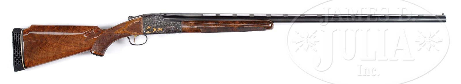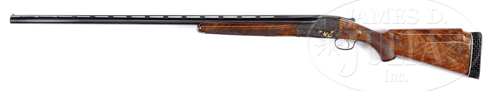 *GORGEOUS HIGH ART ITHACA DOLLAR GRADE KNICK MODEL SINGLE BARREL TRAP.SN 240405727. 12 ga. 34″ bbl. 3″ chamber. CHOKED: Full. Full length matted ventilated rib with white plastic mid and front bead. Gold plated checkered single trigger, automatic ejectors, no safety. Capped full pistol grip buttstock, checkered in fancy scalloped and arrow pattern with panel at comb and checkered side panels. Buttstock is incredible iridescent flame grain American walnut with small Monte Carlo and 14-1/4″ LOP over black Pachmayr waffle pad, gold shield in toe. Trap forend near full coverage checkered in point and scallop pattern with Deeley release. Receiver is full coverage scroll and game scene engraved. Three ducks and marsh scene in gold on left three pheasants in field scene on right, also in gold. Quail in woods scene in gold on bottom and duck in marsh scene on trigger guard. Sides of bbls are full coverage scroll engraved and marked “Ithaca Gun Co.” in banner. According to our consignor, this was the very last Ithaca Dollar Grade made. WEIGHT: 9 lbs. PROVENANCE: The Collection of Robert Burg. CONDITION: Extraordinarily fine, near new. Retaining nearly all orig finish to both wood and metal. Likely test fired only. Buttstock and forend with minute handling marks. Mechanics are excellent. Brilliant shiny bore. An incredible high art Ithaca. 49503-13 JSL283 (6,000-10,000) – Lot 1668