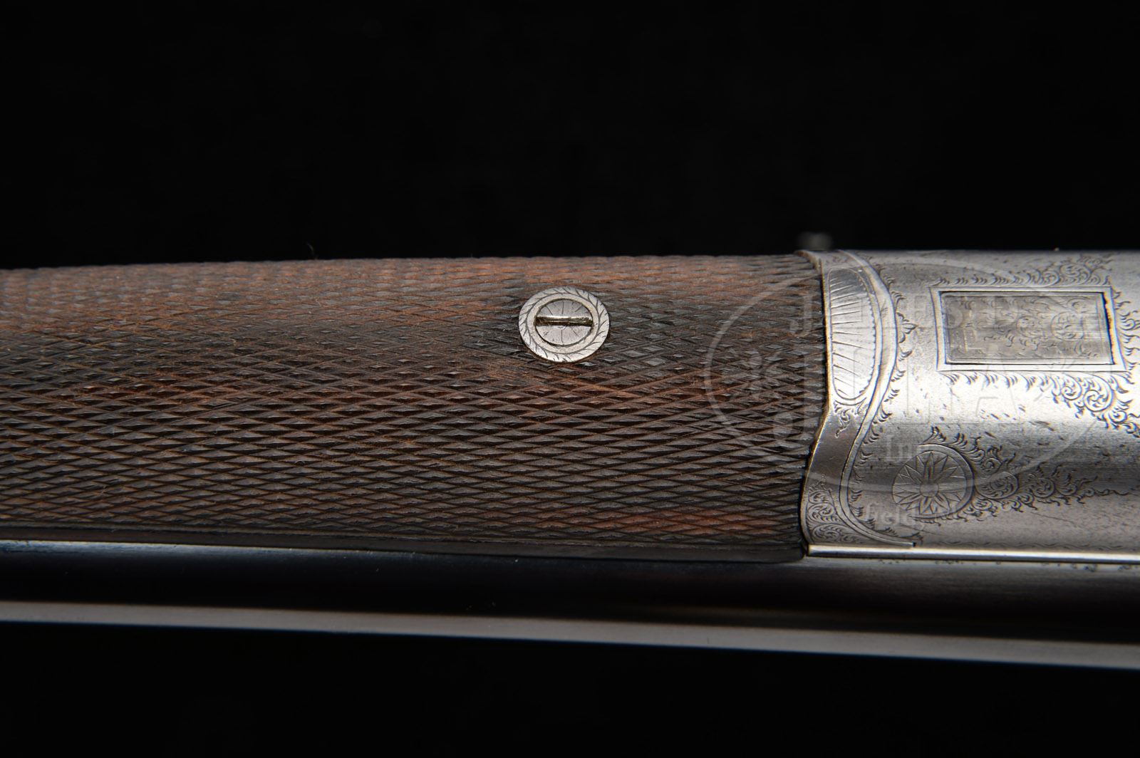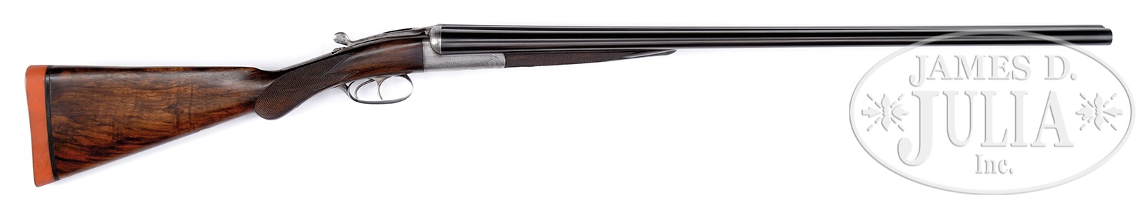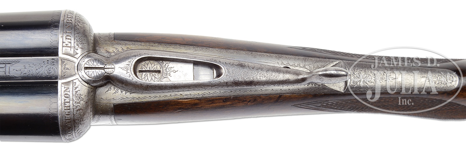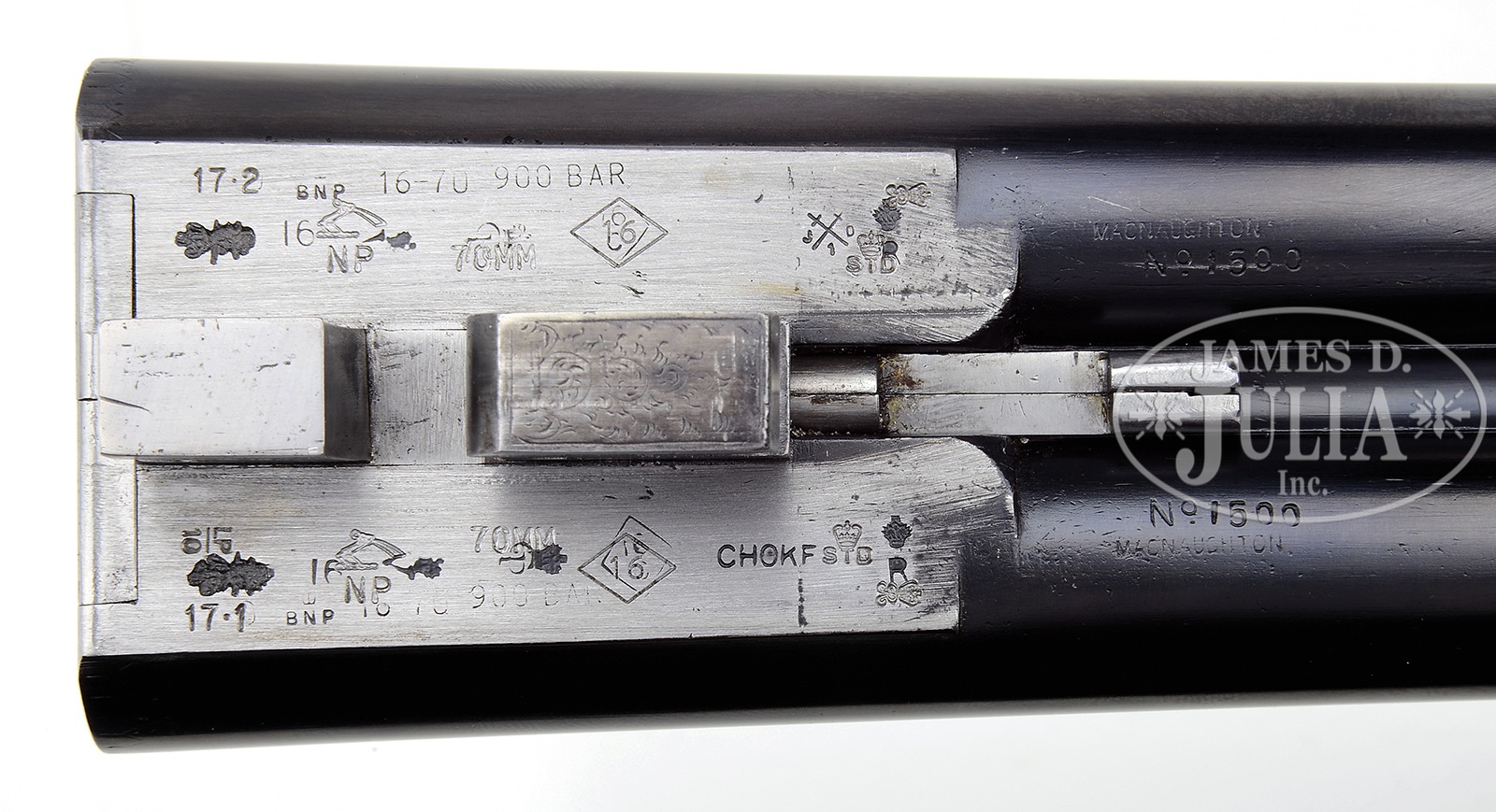 SN 1500. (ca 1890) Cal. 16 ga. 2-3/4″ Chambers. 28″ Bbls with makers name and address on concave game rib, are choked mod and mod. Bbl flats bear 2010 London nitro re-proofs for 2-3/4″ chambers. Round bodied, trigger plate action with long cocking top lever, (patent use “221”) has MacNaughton’s toggle safety on tang, and inspection port through top lever to view hammers, as cocking indicators. Action is engraved with sprays of scroll. “MACNAUGHTON” “EDINBURGH” is over top of fences. Well marbled and lightly figured European walnut round knob pistol grip buttstock measures 14-1/4″ over Silver type pad. Point pattern checkering is at grip. A gold circle on toe line is engraved “1”. Matching splinter ejector (MacNaughton patent use no. “28”) forend has forward pivoting lever release. PROVENANCE: The Timothy Scott Collection. CONDITION: Good, as mostly refinished. Bbls retain nearly all of a lustrous re-black, most likely done at time of most recent re-proof. Action is completely cleaned to silver gray. Stocks are nicely refinished over a number of marks. Pad is relatively new. Checkering re-cut and is sharp. Bores are very fine to excellent with some scattered pits. Action is tight. Mechanically fine. Forward third of forend wood is cracked through on one side, and is quite tender. 50071-2 MGM168 (1,500-2,000) – Lot 1669