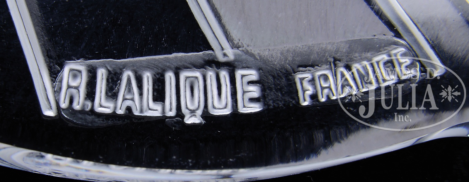 RENE LALIQUE SAINT CHRISTOPHE MASCOT.R. Lalique mascot has circular medallion with frosted intaglio carved image of Saint Christophe carrying a child on his shoulders with radiant lines emanating from the child. Signed on the medallion in impressed block letters “R. Lalique France”. Marcilhac 1142. SIZE: 4-3/4″ t. CONDITION: Very good to excellent. 48965-43 (1,500-1,800) – Lot 1670