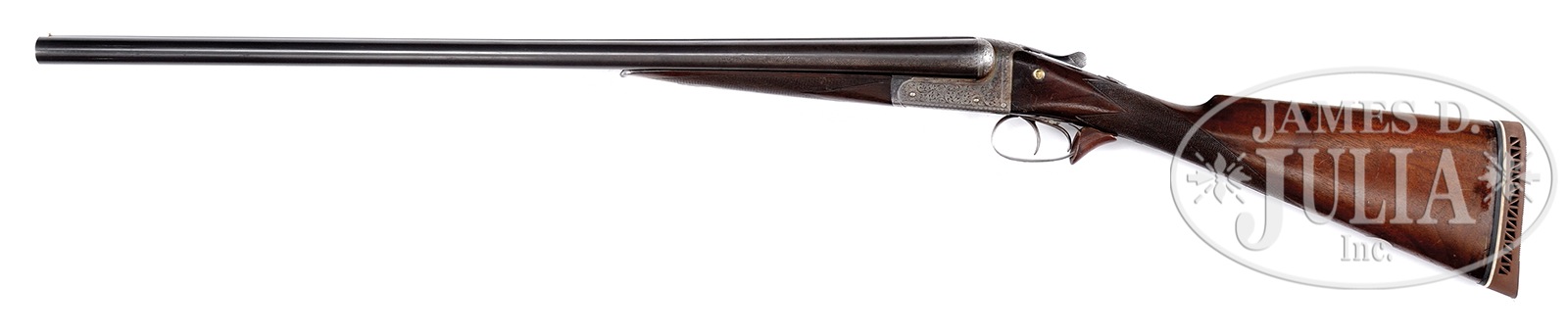 *WILKINSON BOXLOCK EJECTOR GAME GUN.SN 55259. Cal. 12 ga. 26-3/4″ Steel bbls are engraved “Wilkinson Pall Mall London” on game rib, and are choked skeet and skeet. Case hardened boxlock action features automatic safety and double triggers. Action is engraved with near full coverage well cut, open, shaded scroll within geometric and foliate borders. “Wilkinson” is on each side. Steel trigger guard with rubber finger bumper fitted, has SN at grip (This number does not correspond with any listed Wilkinson number, so gun was made after 1920 when the actual maker used their numbers). Relatively plain European walnut straight grip buttstock measures 14″ over white line pad. Flat top point pattern checkering is at grip. A vacant silver oval is on toe line. Matching splinter forend with inlet horn tip and Deeley release is fitted with Baker ejector. CONDITION: Fine. Bbls retain most of what appears to be orig blue, thinning considerably on sides. Rear portion of left bbl is considerably marked. Action retains most of its orig case hardening color. Stocks retain most of their orig finish. New pad does not fit well. A reinforcing bolt is through head of stock. Bores are very fine, lightly frosted. Action is very slightly loose. Stock is loose on action. Ejectors are strong and in time. 49666-2 MGM169 C&R (1,500-2,500) – Lot 1670