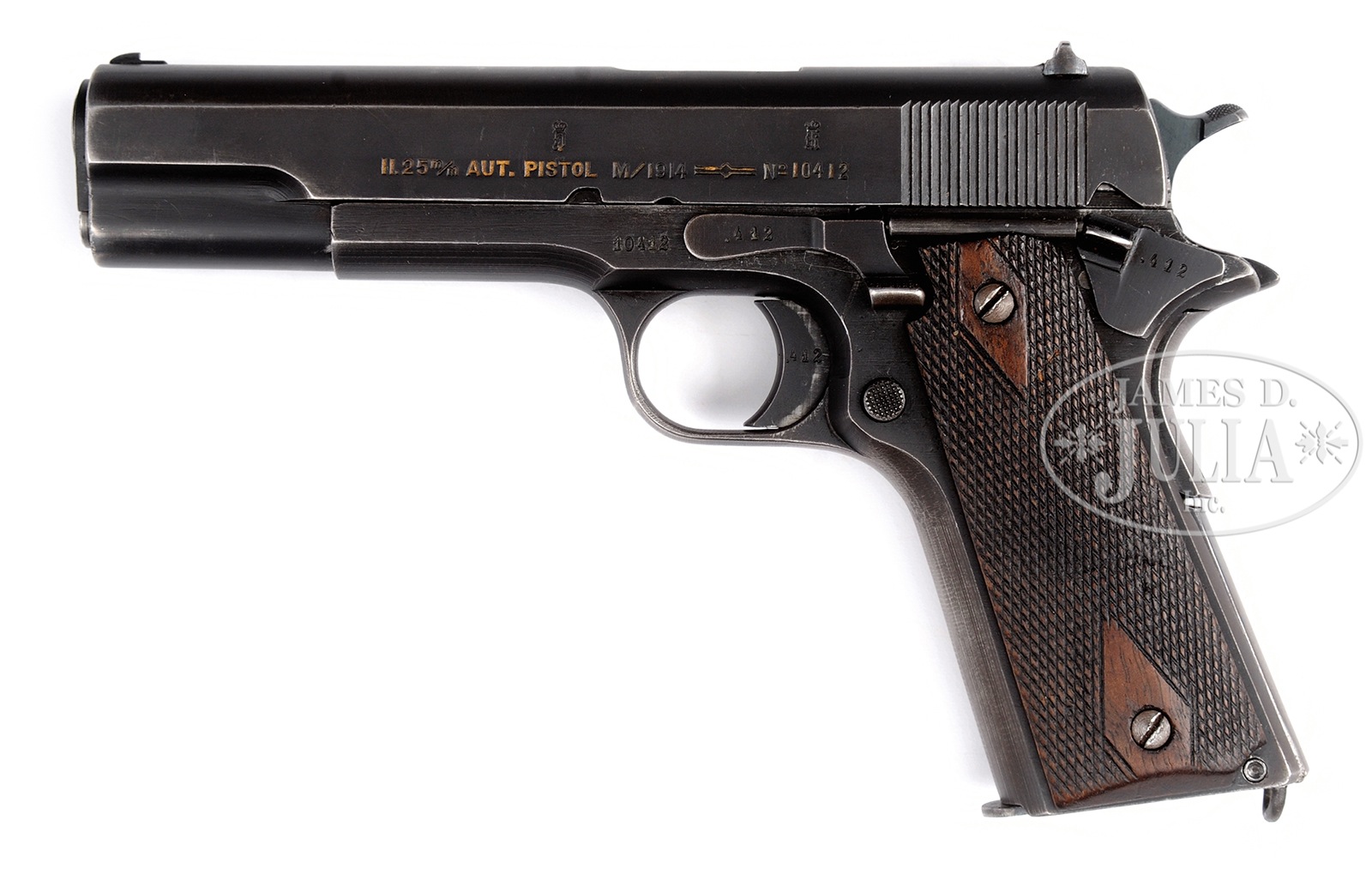 *FINE NORWEGIAN MODEL 1914 DATED 1926.SN 10412. Cal. 11.25mm/45 ACP. Standard 5″ bbl with dark black phosphate finish overall. 2-pc diamond pattern checkered walnut with distinctive cutout for Norwegian slide release. Slide marked on left side “11.25 m/m AUT. PISTOL M/1914 No. 10412” with Norwegian crown proofs on opposite side of slide behind and below ejection port. The date “1926”. Frame on left side has SN in traditional location number 10412 with last 3 digits 412 marked on smaller components, trigger, ejector, safety, grip safety, recoil spring plunger and slide release. Bbl is a U.S. manufactured Flannery bbl and mainspring housing is a Colt-manufactured mainspring housing with lanyard loop. Magazine is from Argentine Ballester Molina. PROVENANCE: Gerard Ruth Collection, ex Jack Whitaker SR. CONDITION: Very fine overall, with very good bore and mechanics. Finish overall very strong with typical muzzle wear and slight wear on flats of slide from holster use. Frame is very good with thin finish on front strap, grip safety and mainspring housing. Several small parts have been replaced but as a whole it is a very good Norwegian Model 1914. 51036-11 TDW (2,000-3,000) C&R – Lot 1670