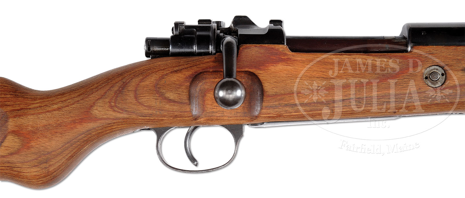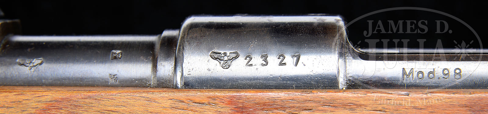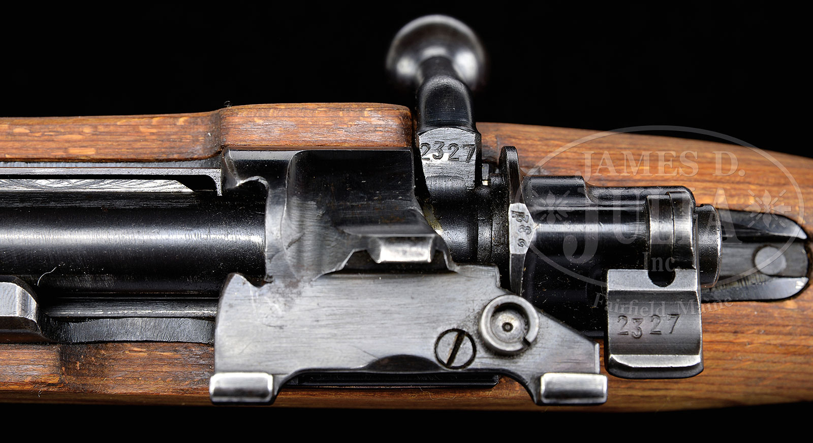 *NEAR MINT CONDITION GERMAN 98K “ar 42” MAUSER FIELD TRIAL SNIPER RIFLE.SN 2327. Cal. 8mm. This fantastic specimen has all matching numbered parts and has correct eagle over 26 proof marks with eagle over Swastika firing proofs. Laminated flat buttplate stock retains it’s SN and eagle over 26 cartouche, however, no issue cartouche present which leads this cataloger to the conclusion that it was never issued. This rifle would have had a low power 1.5x “Aim-point” type scope. The intended purpose was to equip 10% of infantry with a low powered scope which would have high light gathering ability useful at dawn and dusk. This rifle was made at the Mauser plant in Berlin-Borsigwalde (the old DWM plant) with the bolt stop re-designed as a scope base. CONDITION: Absolutely fantastic lustrous, orig finish with some thinning at the muzzle and along the high points with some brassing to the top ears of the scope mount and some areas of light pitting and brown patina on the buttplate which seams to be inescapable on these rifles. Bore is excellent, shiny and bright. Stock is absolutely gorgeous with only the occasional ding, never sanded or messed with. Most of these rifles were apparently lost in the East as were the scopes and are largely overlooked by most German Rifle collectors. 51390-2 (7,500-10,000) C&R – Lot 1672