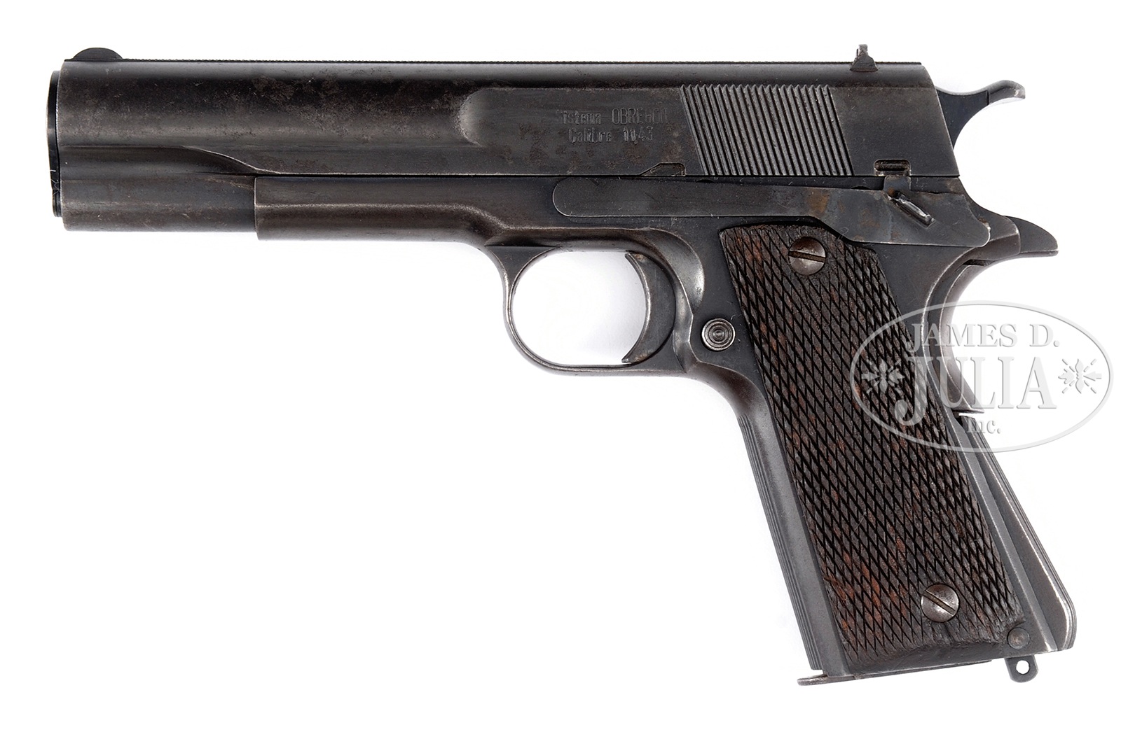 *RARE MEXICAN OBREGON PISTOL NO. 608 OF 1000.SN 608. Cal. 45 ACP. 5″ bbl fixed sights with matted slide. Left side of slide marked “SISTEMA OBREGON CALIBRE 11.43”, 1000 manufactured during World War II for commercial sale in Mexico. Rotating bbl system much like the Steyr or Savage with an overall appearance of the Model 1911 A1. Receiver marked “FABRICA NACIONAL DE ARMAS MEXICO NO. A608”. Blue finish overall. 2-pc checkered walnut grips. 7-rnd Colt pattern 45 magazine with smooth non-checkered wide hammer and serrated frontstrap. CONDITION: Exterior finish has turned a mottled plum finish with dark blue in somewhat protected areas. Bore and mechanics are excellent. Grips are slightly worn but very good with no breaks or cracks. An extremely rare 1911 derivative infrequently encountered. 51034-11 TDW (1,000-2,000) C&R – Lot 1673