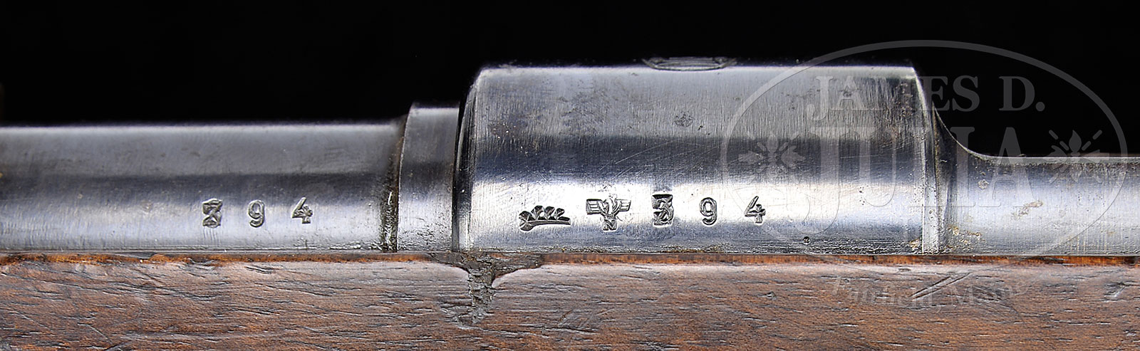*EXTREMELY EARLY MAUSER BANNER 98K RIFLE WITH SS DEPOT MARK.SN 394. Cal. 8mm. Fine example of early Mauser Banner rifle with low SN. Eagle over “N” proof with commercial proof on left side of receiver band, matching bolt also retains eagle proofs and tiny eagle over 140 visible at rear of firing pin. Stock is 1-pc walnut with Mauser eagle over 135 proof mark on wood stock at pistol grip with incongruous feature of having cupped buttplate proofed “gqm” (Loch & Hartenberger, Metallwarenfabrik) with “43” and eagle over WaA 286 proof. Floor plate exhibits SS depot marking which resembles a “Z” with a spike through it. Trigger guard floor plate and screws otherwise devoid of markings. SS was not able to procure rifles through normal channels until 1941. They had to scrounge ordnance equipment and would acquire commercial Mauser’s and parts and scrub parts of markings in just such a manner as this floor plate has been treated. This rifle includes and orig leather sling. Forend cap, bbl band, bbl, receiver and bolt all appear to be matching numbers, bayonet lug is unnumbered as is rear sight. CONDITION: Overall appearance and finish ranging from very good to fine with most of the 60% lustrous blue finish on bbl and receiver with balance of metal parts a gray patina. Stock shows some noticeable handling marks, small chips and bruises but is still attractive and without cracks. The bore’s lands exhibit some light pitting with the grooves turning dark. Early Banner rifles are scarce, ones with these marking exceedingly so. A fine opportunity for the German Military collector. 51390-3 (3,500-4,500) C&R – Lot 1673
