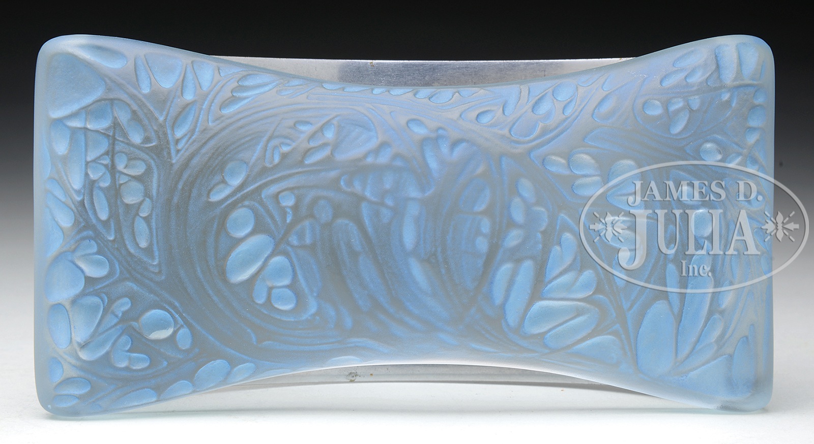 RENE LALIQUE FEUILLES D’ARTICHAUT ROCKER BLOTTER.R. Lalique rocker blotter in the Feuilles D’Artichaut pattern depicts stylized artichoke leaves covering the entire frosted glass handle. The pattern is further highlighted by light blue patination. The blotter retains its original metal rocker. Signed on one end with raised block letters “R. Lalique”. Marcilhac 155. SIZE: 6-3/4″ l. CONDITION: Very good to excellent. 48965-19 (800-1,000) – Lot 1675