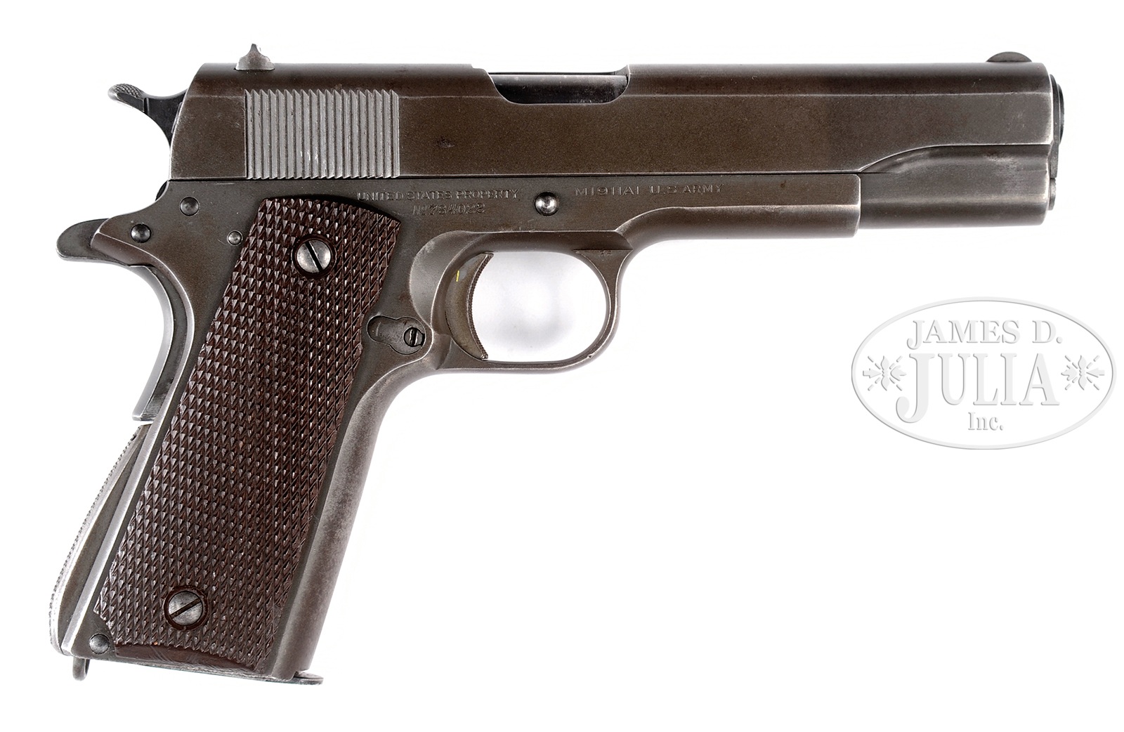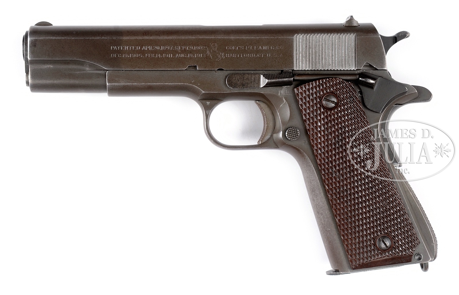 *VERY GOOD COLT 1911 A1 1942 MANUFACTURE.SN 784022. Cal. 45 ACP. 5″ bbl with Parkerized finish overall. Traditional 2-line patent and address markings with rampant Colt in center. Large P proof on top of slide forward of rear sight. Frame has traditional “U. S. Property” markings with SN and “M1911 A1 U.S. Army”. Left side of frame has violent proof. P inspection at magazine release. “WB” inspector’s markings for Waldemar Broburg. Short solid checkered trigger with correct hammer, safety, mainstream housing and wide ring Colt grips. High Standard manufactured bbl. Early production gun with numbered slide matching numbered frame. Complete with Scovill manufactured magazine. PROVENANCE: Gerard Ruth Collection , ex Jack Whitaker SR. CONDITION: Good overall, with Parkerized finish thinning and turning somewhat plum. Finish loss in typical areas of muzzle and high points of slide, safety, tops of sights and mainspring housing. Grip screws are worn bright. Excellent bore and mechanics. 51036-5 TDW (2,000-3,000) C&R – Lot 1676