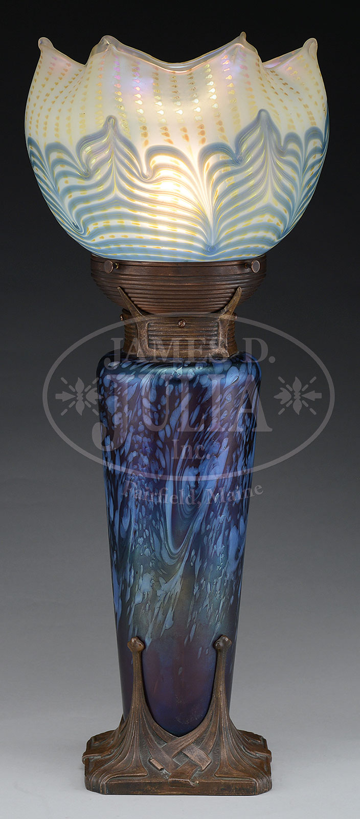 LOETZ/GURSCHNER TABLE LAMP.Austrian table lamp has Loetz shade with blue iridescent pulled feather design descending from the fitter with a gold iridescent zipper design surrounding the shade. All against a lightly iridescent clambroth background. Unsigned. The shade rests on a bronze and glass base with bronze decorated foot and glass body with cream colored swirled decoration within a dark navy blue background. The base is finished with a bronze collar and shade holder. Base is signed on edge of foot “Gurschner Depose”. SIZE: Shade 7″ dia. Lamp 19-3/4″ t. CONDITION: Shade has a few very minor flea bites to fitter rim. Otherwise very good to excellent. Base is very good to excellent. 51966-39 (3,000-5,000) – Lot 1676