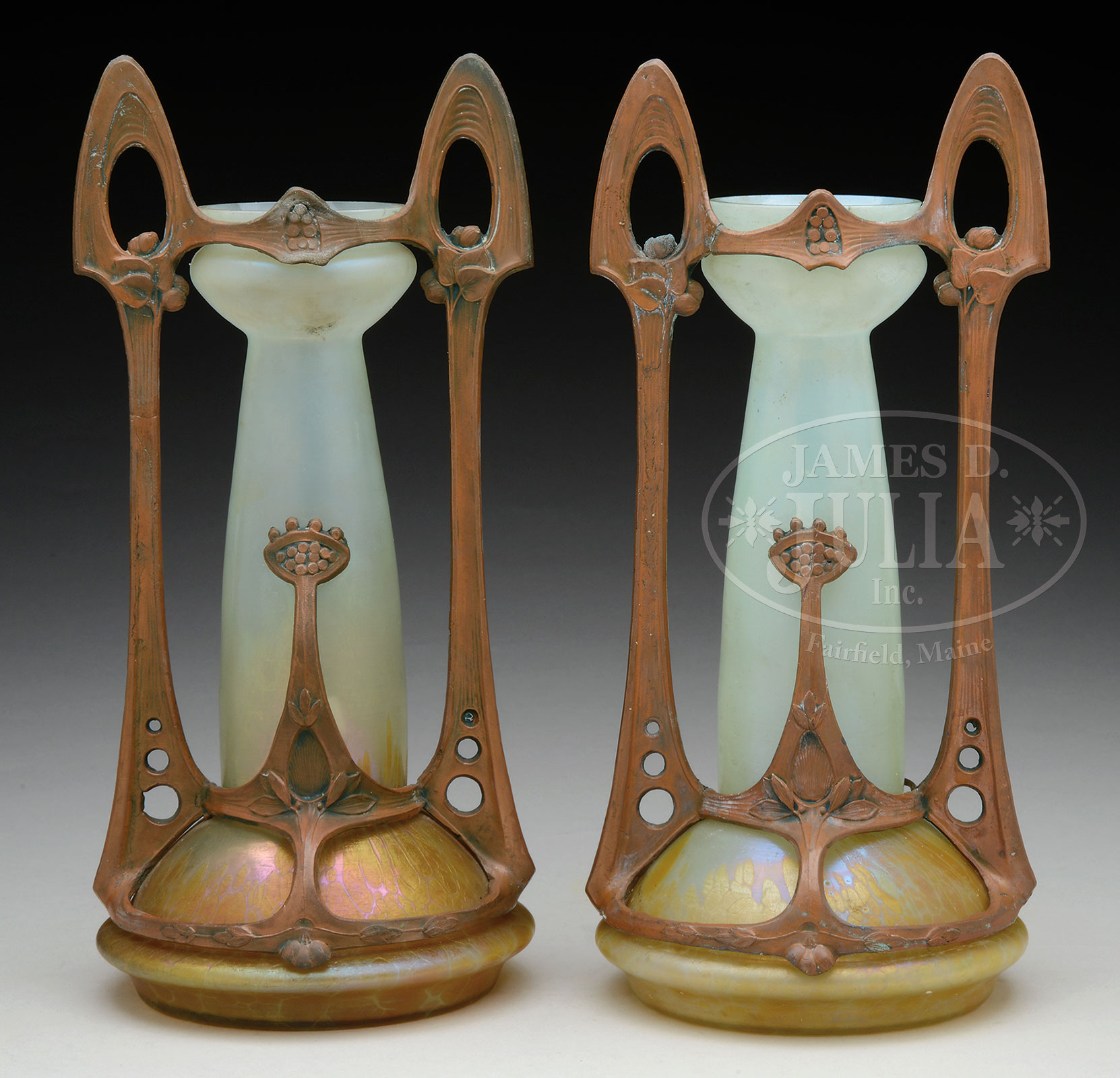 PAIR OF AUSTRIAN ART GLASS VASES.Pair of art glass vases have gold iridescent oil spot decoration encircling the bottom of the vase against a slightly iridescent clam broth background. Each vase is housed within a cast metal Art Nouveau frame with stylized flower form handles. The cast metal is finished in a bronze tone. Unsigned. SIZE: 10-1/4″ t. CONDITION: One cast metal frame has a break near one handle, otherwise very good. 51088-26 (600-900) – Lot 1678