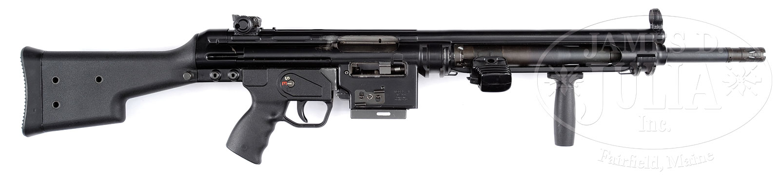 *FABULOUS HECKLER & KOCH SPECIAL HEAVY BARRELED BELT FED ADAPTED MODEL 21 SEMI-AUTO RIFLE.SN H2116. Cal. 308. 25″ bbl. Absolutely tremendous, high quality H&K Model 21 belt fed semi-auto gun with quick detachable bbl. Currently equipped with a semi-auto pistol grip assembly. If one had the appropriate full auto trigger pack, this would be one hell of a machine gun! Marked “XG3S FMP V237” on top of receiver and on right side below feed way “MODEL 21″ with Vollmer Mfg address. Equipped with a vertical foregrip and heavy duty rear sight with composite buttstock and pistol grip, this rifle is designed for heavy duty use. Firing mechanism moves smoothly when operated by hand. Feed mechanism as well as rest of gun appears fully functional. PROVENANCE: From the Estate Collection of Noted Discerning Firearms Enthusiast, Donald W. Dix, Jr. CONDITION: Overall appearance and finish extremely fine to near excellent, orig finish with some brassing and loss of finish in an area of about 1-1/2” to the rear of the ejection port with some slight areas of high edge wear at bipod attachment points. Feed mechanism and feed way exhibit loss of finish where a belt has obviously been running through this gun. Other areas of high edge wear at buttstock, assembly edge, and forward edge of metal where hand grip attaches. Bore is near excellent, shiny and bright. Composite furnishings near excellent with a couple of very light scuffs. It would be pretty hard to improve on this 308 projectile launching system. 51794-10 JWK (7,000-12,000) – Lot 1679