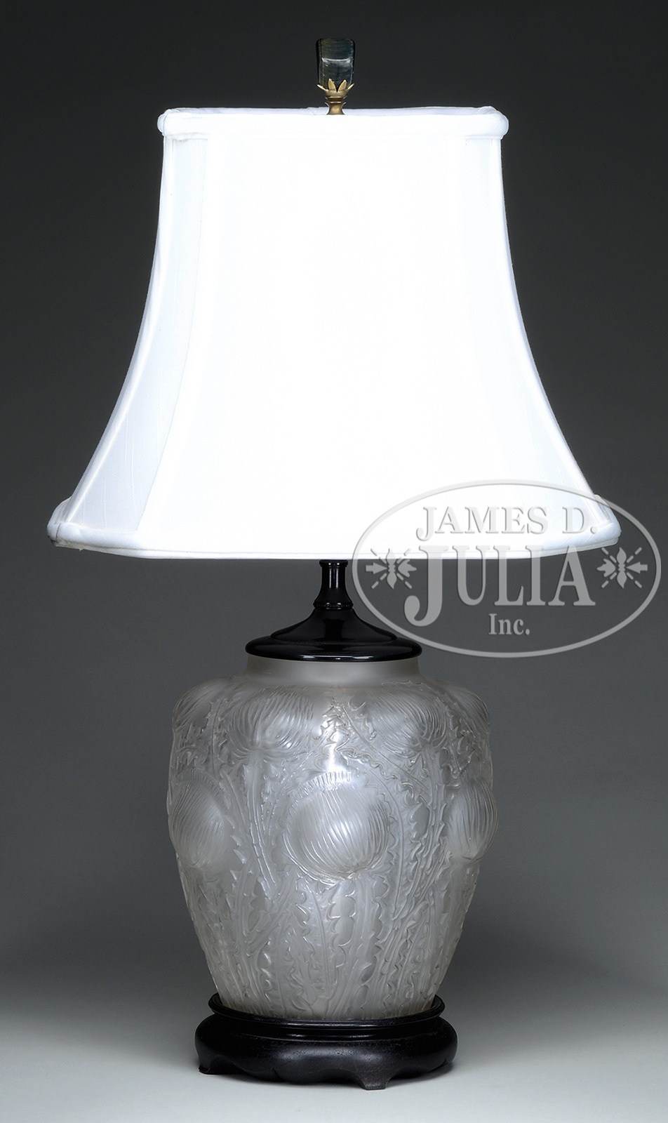 LALIQUE DOMREMY LAMP.Lalique lamp base in the Domremy pattern is impressed with high relief thistle flowers and leaves in frosted clear glass. Glass is mounted on a turned wooden base and fitted with a cap and harp. Lamp is completed with a white fabric shade. SIZE: 22-1/2″ t. CONDITION: Very good to excellent. 48965-29 (1,000-1,200) – Lot 1680