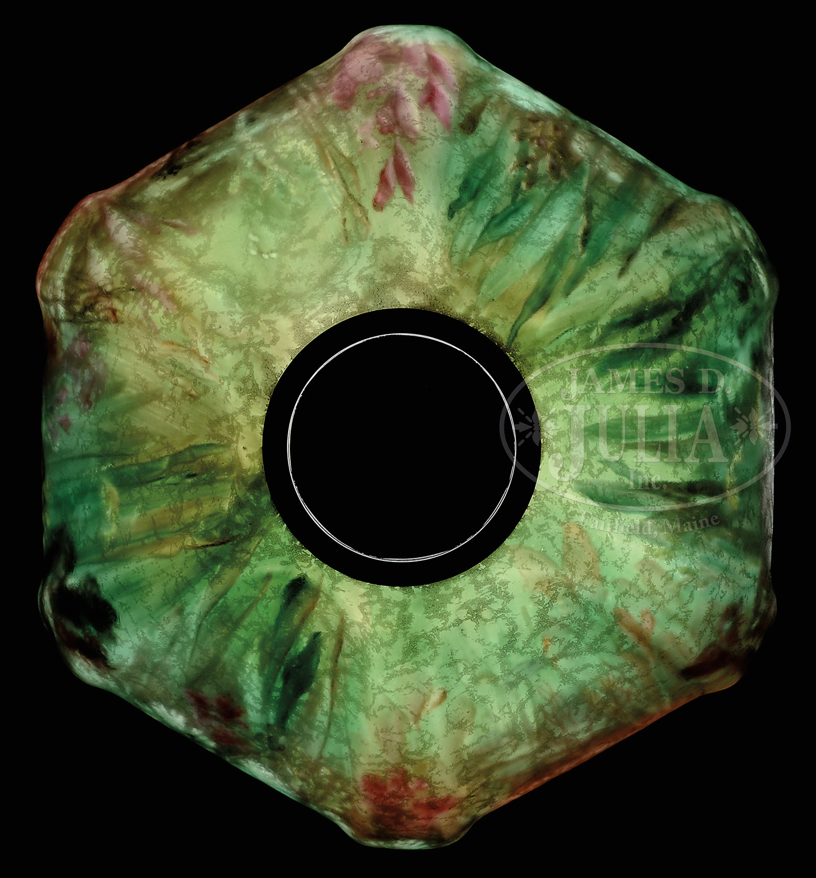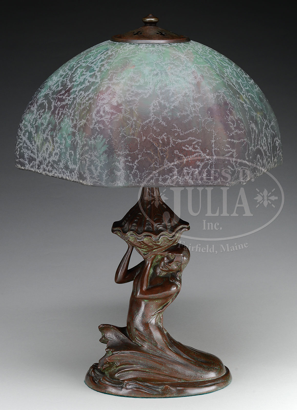 HANDEL REVERSE PAINTED UNDERWATER LAMP.Handel reverse painted shade has underwater scene with fish swimming through aquatic vegetation against a shaded green background. Shade is signed on the interior “Handel 6393”. The exterior of the shade is finished in chipped ice. The shade rests on an original Handel mermaid base with brown finish, 3-socket cluster and fleur-de-lis heat cap. Base is signed on the underside with applied cloth tag “Handel”. SIZE: Shade 15-1/4″ dia. Lamp 21-3/4″ t. CONDITION: Shade is very good to excellent and base is very good to excellent. 52005-1 (30,000-40,000) – Lot 1685