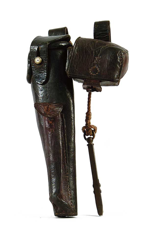 FINE KM HOLSTER RIG. Marked with crown over “KM” on holster, extra cylinder container and the capper. The number “943” is on the belt loop for the holster and “99” is on the belt loop for the extra cylinder container. CONDITION: Leather has minor cracks but has been treated. Stitching is loose between the extra cylinder container and the holster. 4-47587 FS802 (1,000-2,000)
