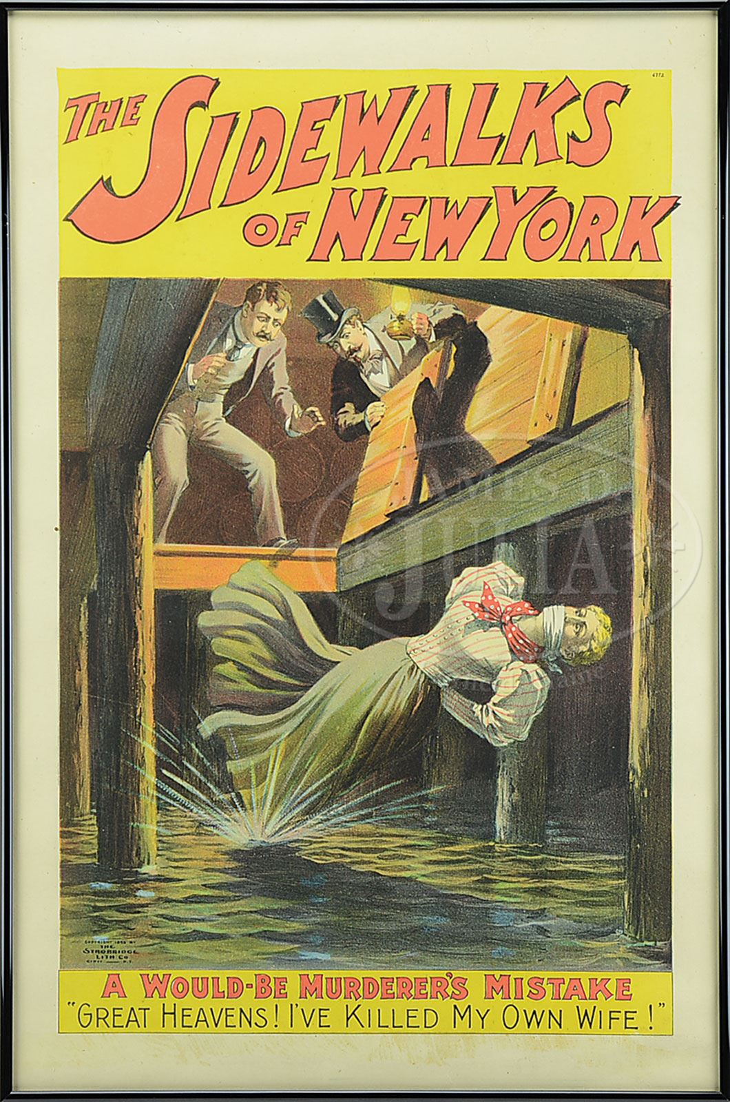 LOT OF 2 “SIDEWALKS OF NEW YORK” THEATER POSTERS.1) Image of damsel in distress falling through a warehouse trap door into the East River, captioned “A Would Be Murderer’s Mistake Great Heavens! I’ve Killed My Own Wife!” Copyright 1895 by the Strobridge Litho Co., Cincinnati & New York. 2) Humorous illustration of a bear and Italian-American gent dancing together in “A Scene In Little Italy”. Copyright 1895 by the Strobridge Litho Co., Cincinnati & New York. SIZE: Both Images: 19-3/8″ w x 29-1/4″ h. PROVENANCE: The Collection of Richard J. Miller. CONDITION: 1) Very good to excellent; appears dry mounted to remove some very light creases to the upper portion. 2) Near excellent with a few tiny closed margin tears. 1-14964 (700-900) – Lot 1694 Auction: Advertising, Toy & Doll Auction - Fall 2014 Please Note: All prices include the hammer price plus the buyer’s premium, which is paid by the buyer as part of the purchase price. The prices noted here after the auction are considered unofficial and do not become official until after the 46th day. |