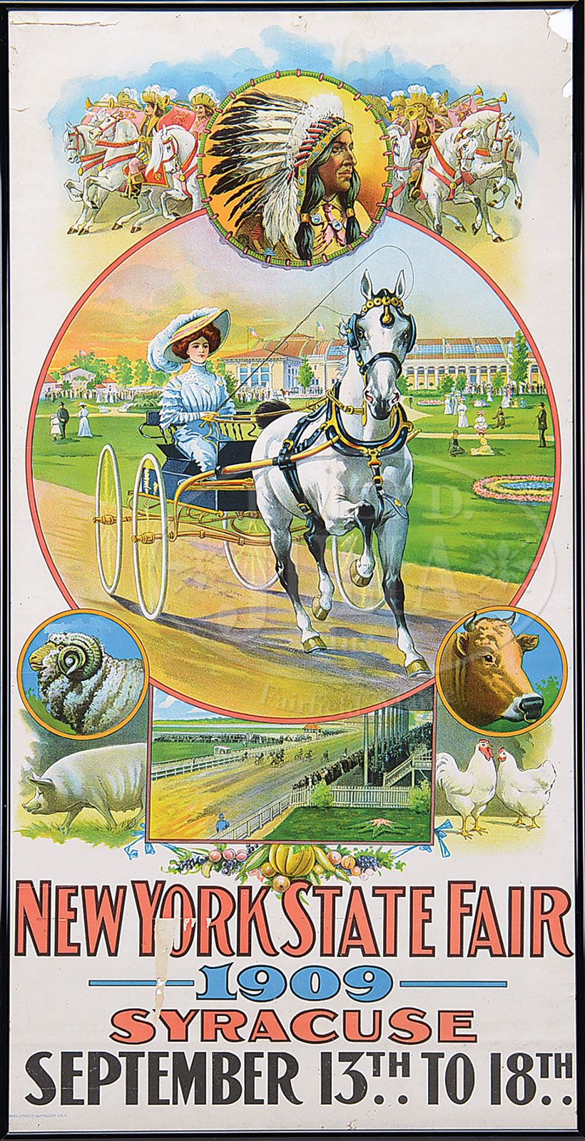 LOT OF 3 MINSTRAL, STAGE AND STATE FAIR POSTERS.1) New York State Fair poster for 1909 which was held in Syracuse, N.Y. Image of lovely lady with trotter and buggy on the track with a montage of farm animals, produce and related Fair activities. 2) “Jesse James” stage theater poster for “The Missouri Outlaw” and his gang. The Donaldson Litho. Co., Newport, KY. 3) Neil O’Brien Minstrels promotional poster for band instruments from Frank Holton & Co. of Elkhorn, W.I., depicts two Minstrel troupe and their musical instruments. Otis lithograph Co., Cleveland, OH. SIZE: Image: 16-1/4″ w x 33″ h. 2) Image: 17-1/4″ w x 27-1/4″ h. 3) Image: 40-3/4″ w x 26-1/2″ h. PROVENANCE: The Collection of Richard J. Miller. CONDITION: 1) Good to very good; some paper loss and tears across top margin; small tear and skinning to lower portion where banner sheet was pasted. 2) Near excellent. 3) Near excellent. 1-14968 (600-900) – Lot 1695 Auction: Advertising, Toy & Doll Auction - Fall 2014 Please Note: All prices include the hammer price plus the buyer’s premium, which is paid by the buyer as part of the purchase price. The prices noted here after the auction are considered unofficial and do not become official until after the 46th day. |