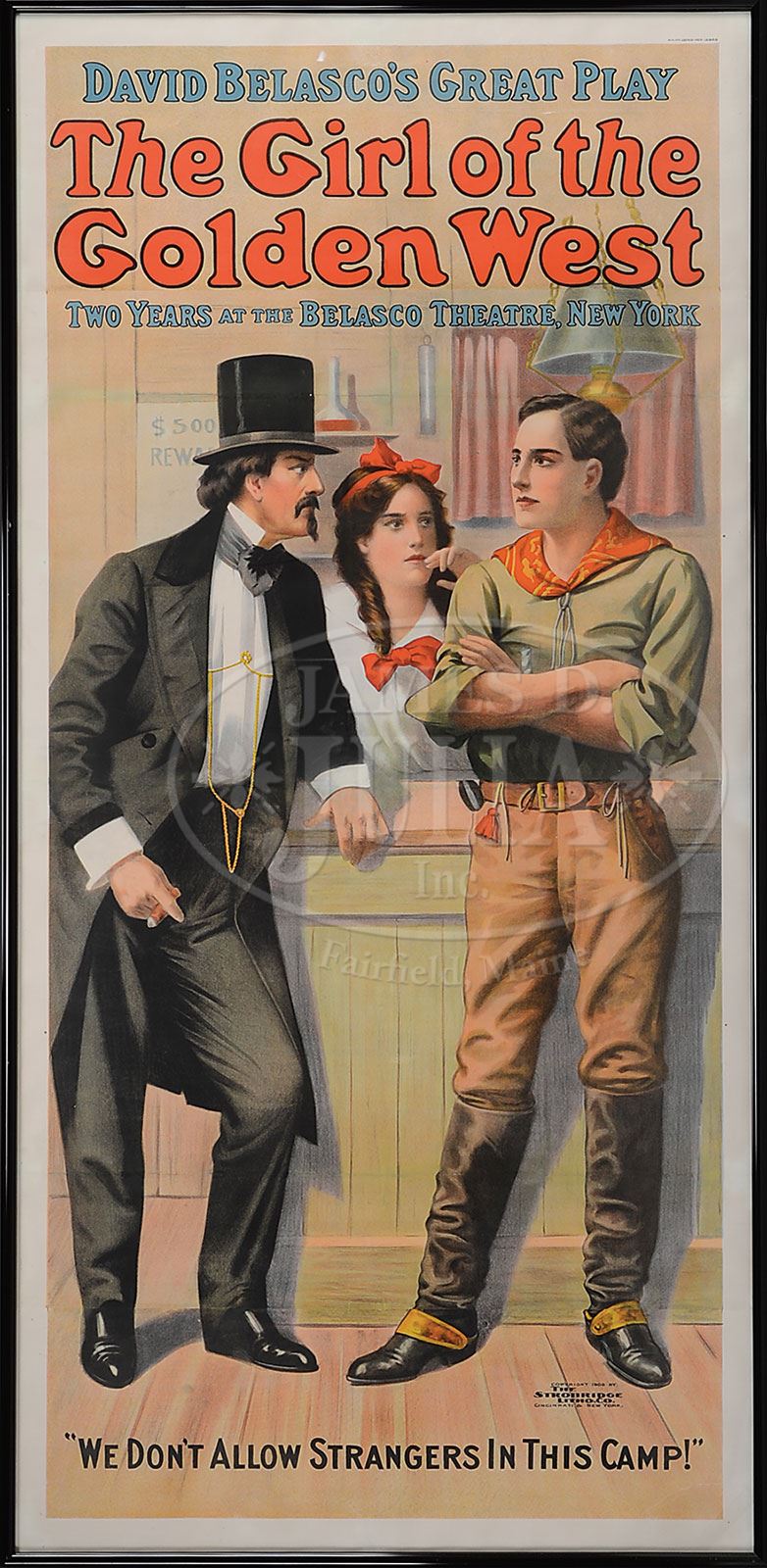 “THE GIRL OF THE GOLDEN WEST” 1909 THEATER POSTER.Three-sheet theater poster for David Belasco’s production at the Belasco Theater, New York. Story of Mary Robbins, saloon keeper in a rowdy western mining town, who falls for an outlaw disguised as a Cavalry officer, shown in a confrontation with the local lawman. Captioned “We Don’t Allow Strangers In This Camp”. Copyright 1909 by The Strobridge Litho Co., Cincinnati & New York. SIZE: Image: 39-1/2″ w x 82-1/2″ h. PROVENANCE: The Collection of Richard J. Miller. CONDITION: Displays near excellent with some professional color touch up to horizontal seams. 1-15071 (400-600) – Lot 1698 Auction: Advertising, Toy & Doll Auction - Fall 2014 Please Note: All prices include the hammer price plus the buyer’s premium, which is paid by the buyer as part of the purchase price. The prices noted here after the auction are considered unofficial and do not become official until after the 46th day. |