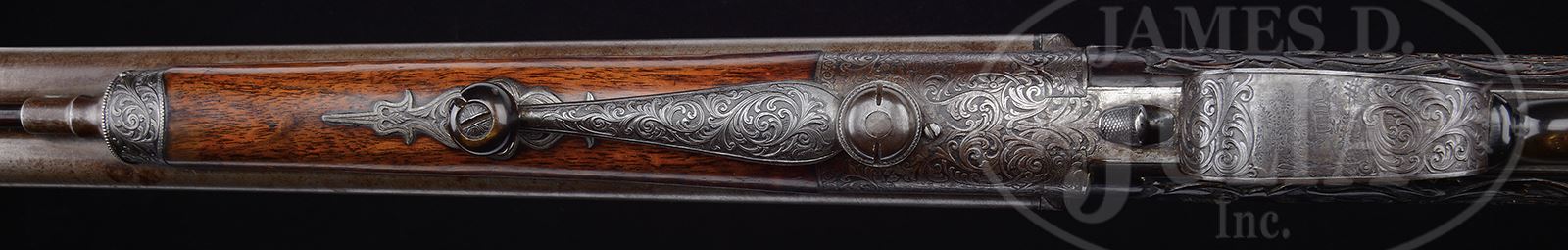 FINE CARVED & ENGRAVED NEEDLEFIRE DOUBLE BARREL SHOTGUN WITH ROYAL CREST.SN NSN. Cal. 16 GA. Beautiful 31″Damascus bbls marked on rib “TESCHNER & STURM – PATENT”. Breech receiver, cocking arm & other iron mounts are deeply engraved with floral & animal motifs. Top of breech has a gold inlaid crown above a shield with mark of a nobleman. Stock is beautifully carved in relief including large panel of a dog pack. CONDITION: Very good overall. Metal is grey with sharp edges with no orig finish. Engraving all discernible. Wrist has old break and contemporary repair as can be seen in photos. Small piece of wood missing on right side of buttstock where it adjoins breech. Gun appears functional, cocking arm exposes needles with bright shiny bore. 49253-17 JS (2,500-4,500) – Lot 1699