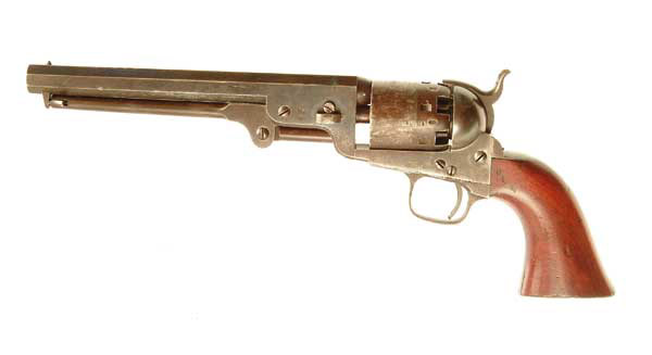 COLT LONDON NAVY REVOLVER. SN 42224, all matching including wedge. The wedge screw is replaced. Cal. .36, 7-1/2″ oct. bbl. CONDITION: 40% brown on bbl with dents and light pitting on left side, balance of gun is brown patina with moderate to heavy pitting on the backstrap and trigger guard. Grips have light wear at the base but retain about 90% of the varnish. 4-46338 FS108 (2,000-4,000)
