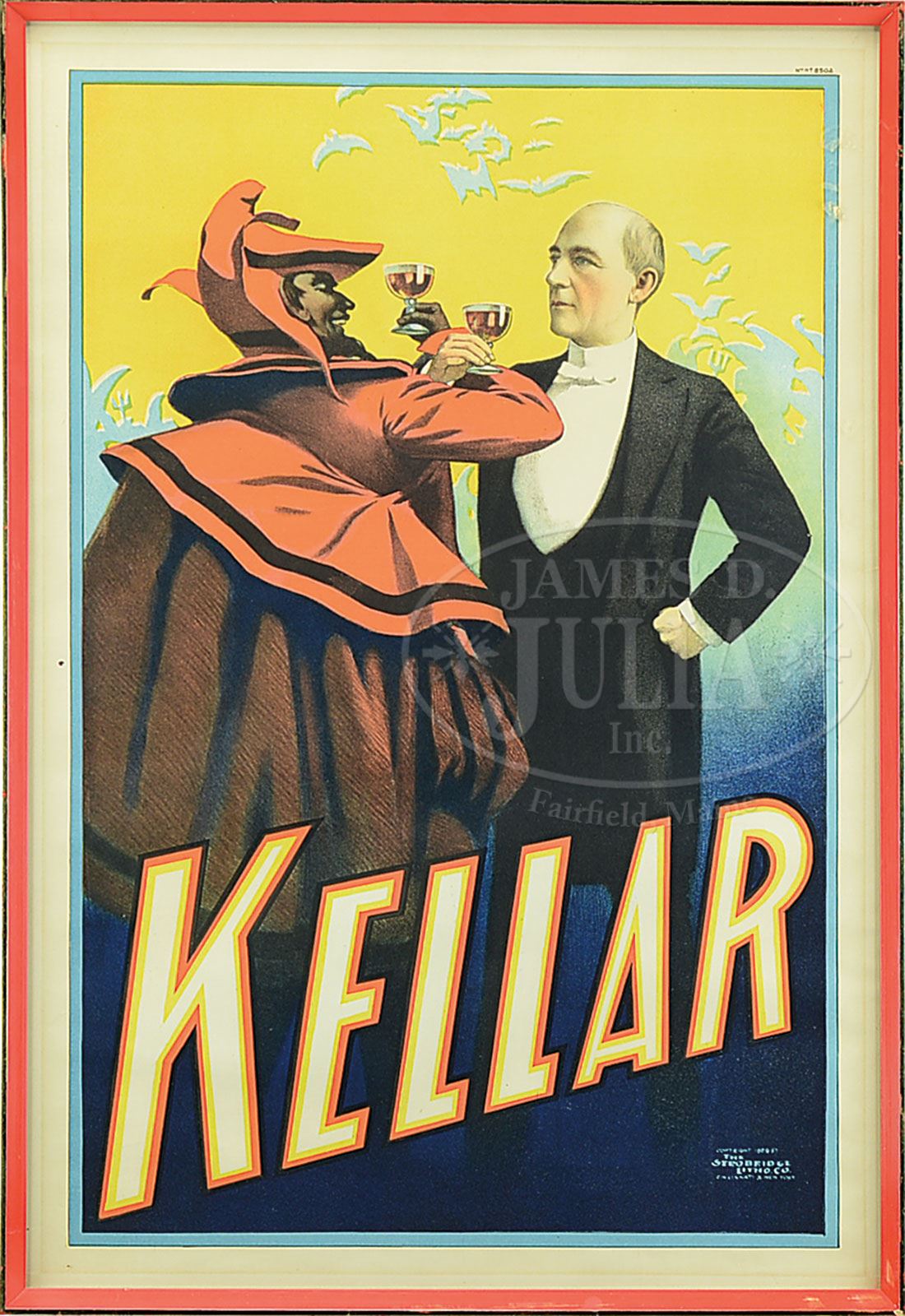 LOT OF 2 KELLAR MAGICIAN POSTERS.1) Illustration of Harry Kellar (Heinrich Keller) raising a toast arm in arm with Faust, the devil himself. Copyright 1899 by the Strobridge Litho Co., Cincinnati & New York. 2) “Kellar The Great Magician” protrayed with little imps whispering in his ears. Copyright 1894 by the Strobridge Litho Co., Cincinnati & New York. SIZE: Both are half sheet sizes, with images being 18-3/4″ w x 28-1/2″ h. PROVENANCE: The Collection of Richard J. Miller. CONDITION: 1) Near excellent. 2) Near excellent. 1-14996 (2,000-3,000) – Lot 1705 Auction: Advertising, Toy & Doll Auction - Fall 2014 Please Note: All prices include the hammer price plus the buyer’s premium, which is paid by the buyer as part of the purchase price. The prices noted here after the auction are considered unofficial and do not become official until after the 46th day. |