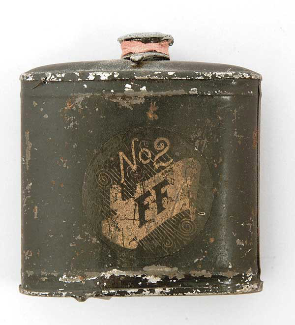 VERY RARE SEALED CALIFORNIA POWDER WORKS TIN. 1/2-lb marked “GUNPOWDER/UNION/MILLS AT/SANTA CRUZ /THE/CALIFORNIA POWDER WORKS,/SAN FRANCISCO.” in gold on a black label. The back label is “No2. /FF”. The lead lid is still attached with 1/4″ fabric tie running behind label. CONDITION: Gold has faded some on the labels, there is chipping of black paint around the edges. 4-47329-83 FS548 (500-800)