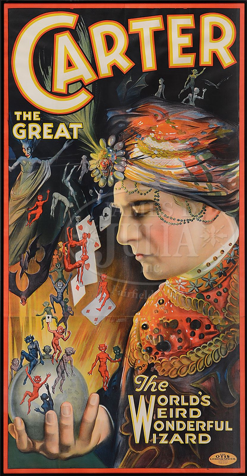 CARTER THE GREAT “WORLD’S WEIRD WONDERFUL WIZARD” MAGIC POSTER.Three-sheet poster depicting Carter with crystal ball in hand conjuring, raining playing cards and imps. The Otis Lithograph Company, Cleveland, O. SIZE: Image: 38-1/4″ w x 74-1/2″ h. PROVENANCE: The Collection of Richard J. Miller. CONDITION: Near excellent; exhibits soft rippling. 1-15080 (600-800) – Lot 1707 Auction: Advertising, Toy & Doll Auction - Fall 2014 Please Note: All prices include the hammer price plus the buyer’s premium, which is paid by the buyer as part of the purchase price. The prices noted here after the auction are considered unofficial and do not become official until after the 46th day. |