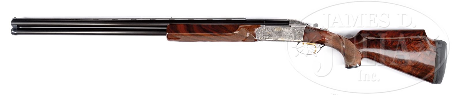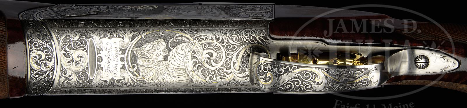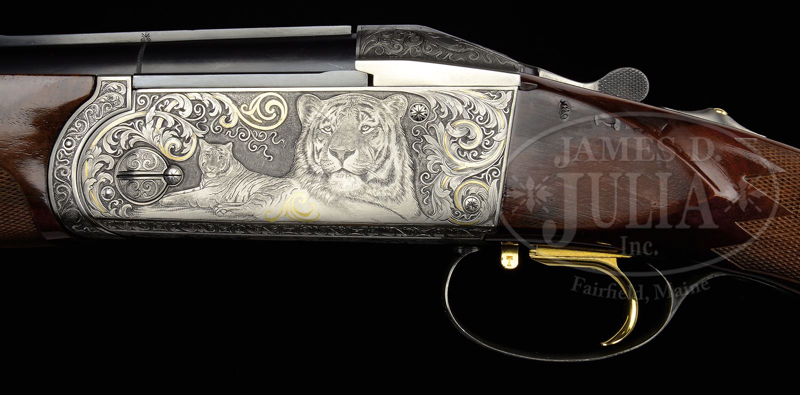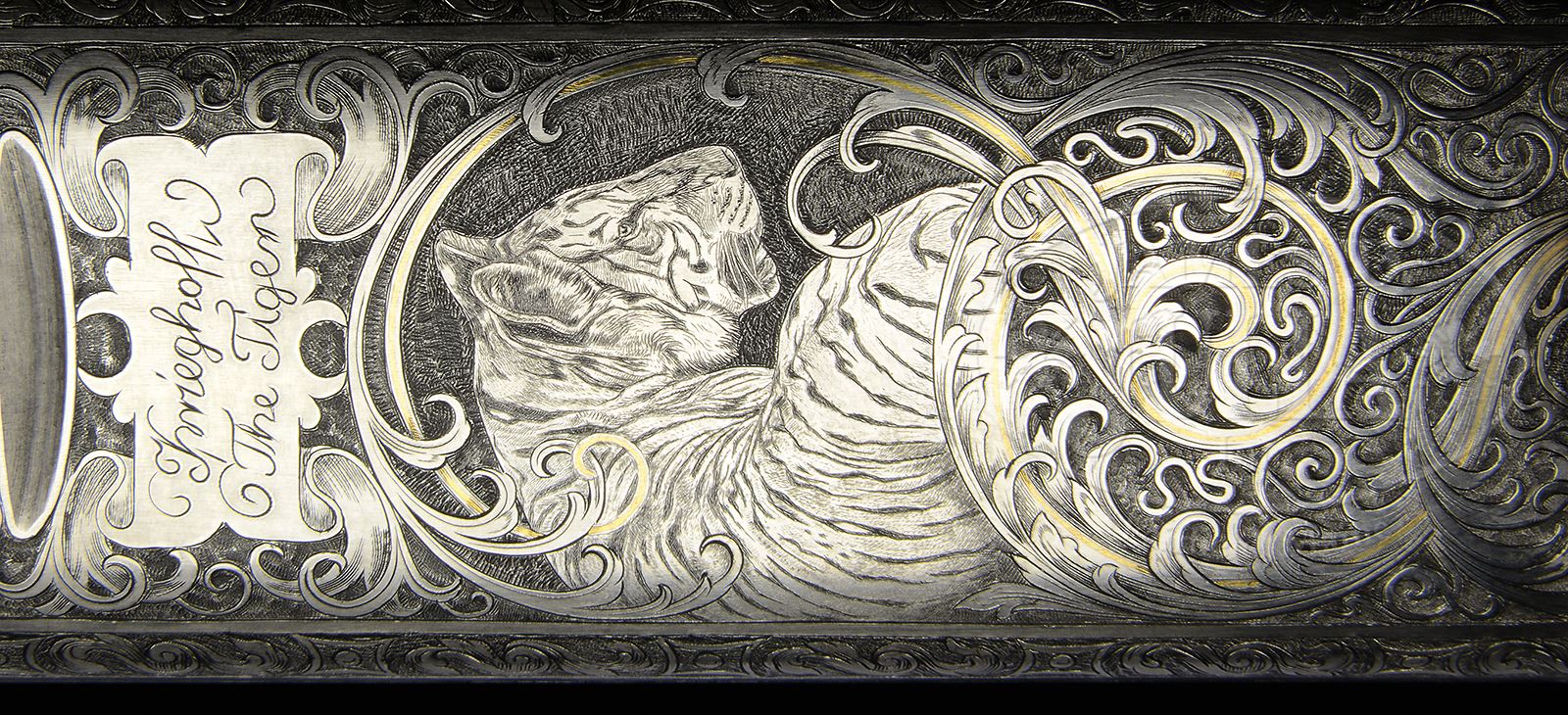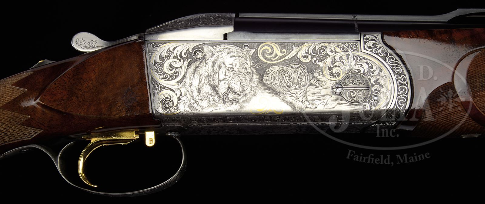 *KRIEGHOFF K32 WITH TIGER MOTIF ENGRAVING WITH CASE.SN 5125. Cal. 12 ga. 2-3/4″ Chambers. 30″ Mono-bloc bbls marked for IMod and full, are marked “MADE IN W GERMANY” “SHOTGUNS OF ULM”, and with SN 6016. Coin finished K 32 action fitted with selective single trigger is very finely engraved with motifs of well detailed tigers surrounded by large open shaded scroll with gold inlaid tendril highlights. Bottom of action is engraved “The Tiger” in script. No signature found. Flame figured American walnut capped pistol grip buttstock has black KICKEEZ pad, and features tall Monte Carlo adjustable comb, point pattern checkering with ribbon through pattern, and composition grip cap with oval on bottom engraved “BRENT UMBERGER MASTER STOCKMAKER”. Matching semi-beavertail forend has Deeley type release. This shotgun is engraved by German engraver Silke Ulrich. This shotgun is featured on the engravers website. Bore diameter: top -.733, bottom -.731. Bore restrictions: top -.033 (full), bottom -.022 (Mod). Drop at heel: 2-9/16″, drop at rear of Monte Carlo (lowest position): 1-5/16″, drop at comb (lowest position): 1-3/8″. Weight: 9 lbs 0 oz. LOP: 14-1/8″. Dark leather case has central medallion marked “OUTRE”. Case is lined in burgundy cloth and contains a pair of snap caps and Outre fob and keys. CONDITION: Excellent. Bbls retain 95 – 99% blue with numerous light marks. Action retains essentially all of its coin finish. Stocks retain nearly all of their finish with some light marks and areas rubbed where finish has been marred and dented, most notably on left side at head and side of toe. Bores are excellent, mismatched bbls do not fit well, are very tight (can be re-fitted by factory or a talented gunsmith). Case is near new, with a few light marks on exterior. 48836-5 MGM64 (10,000-20,000) – Lot 1707