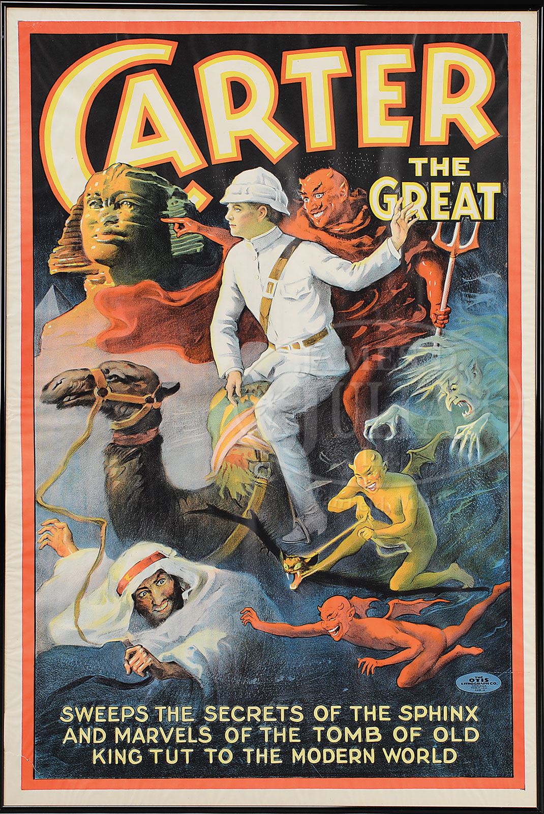 Illustration of Carter the Great riding atop a camel in safari garb flanked on all sides by images of a devil, Arab sheik, Sphinx, and haunting specters. Captioned “Sweeps the Secrets of the Sphinx and the Marvels of the Tomb of old King Tut to the Modern World”. The Otis lithograph Co., Cleveland, O. SIZE: Image: 26-3/8″ w x 40-3/8″ h. PROVENANCE: The Collection of Richard J. Miller. CONDITION: Very good; short margin tear bottom left corner; heavy rippling that could be dramatically reduced by dry mounting. 1-15078 (250-450) – Lot 1708