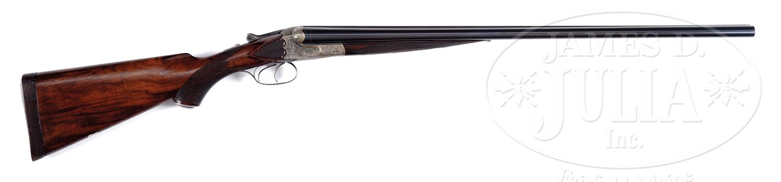 *FINE 20 BORE J. P. SAUER MODEL 40E BOXLOCK EJECTOR GAME GUN.SN 191541. Cal. 20 ga. 2-3/4″ Chambers. 26″ Shoe lump bbls with matted game rib are choked Mod and IC. Case hardened, scallop-backed, boxlock action marked “MADE IN PRUSSIA” features automatic safety, crossbolt third fastener, side clips and dbl triggers. Action is engraved with very well cut open shaded scrolling acanthus surrounding game scenes of birds on sides, and dogs on bottom. Nicely marbled steel capped pistol grip buttstock is fitted with brown leather covered pad, and has inset checkered side panels. Matching splinter ejector forend has Deeley release. Weight: 5 lbs 8 oz. LOP: 14-5/8″. CONDITION: Excellent, as partially refinished. Bbls retain essentially all of a fine re-black. Action retains perhaps 50% orig case hardening color. Stocks retain most of what appears to be their orig finish, with numerous marks, checkering somewhat worn. Repaired crack is on left tip of forend. Bores are fine with scattered pitting and light frosting. Action has a hint of looseness. Ejectors are strong and in time. 49605-1 MGM330 (5,000-8,000) – Lot 1709