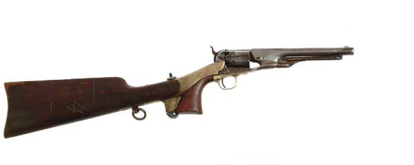 COLT MODEL 1860 ARMY REVOLVER WITH SHOULDER STOCK. SN 54148, all matching. Cal. .44. 8″ bbl. The cylinder has been numbered with the wrong set of dies. The patent marking is correct. Some screws are also replaced. The inspector’s cartouche on the left is visible, but unreadable. Shoulder stock is a replica with the number 152. CONDITION: Gray-brown patina with signs of cleaning and filing. Grips have been repaired at the top, lightly sanded and refinished. 4-46381 FS64 (1,000-1,500)