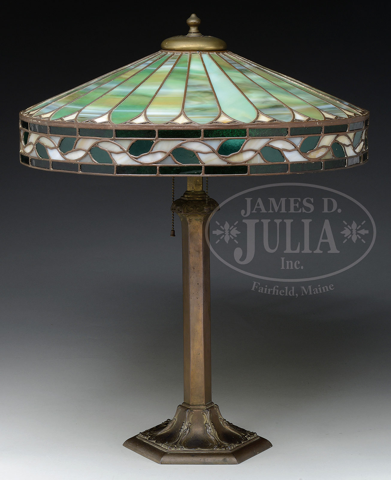 WHALEY (ATTRIBUTED) LEADED GLASS TABLE LAMP.Table lamp has leaded glass shade attributed to Whaley with a border panel of flowing vines and leaves. The green leaves are set against a cream colored background and bordered at top and bottom by green geometric bands. The top of the shade has stylized leaves in green striated glass with small amber triangles at the tip of each leaf. Unsigned. Shade rests on a period metal base with stylized leaf decoration and 2-socket cluster. The base is finished in a light gold. Unsigned. SIZE: Shade 20″ dia. Lamp 25-1/2″ t. CONDITION: Shade is very good to excellent. Base is very good with some wear to finish. 52035-1 (1,000-2,000) – Lot 1712