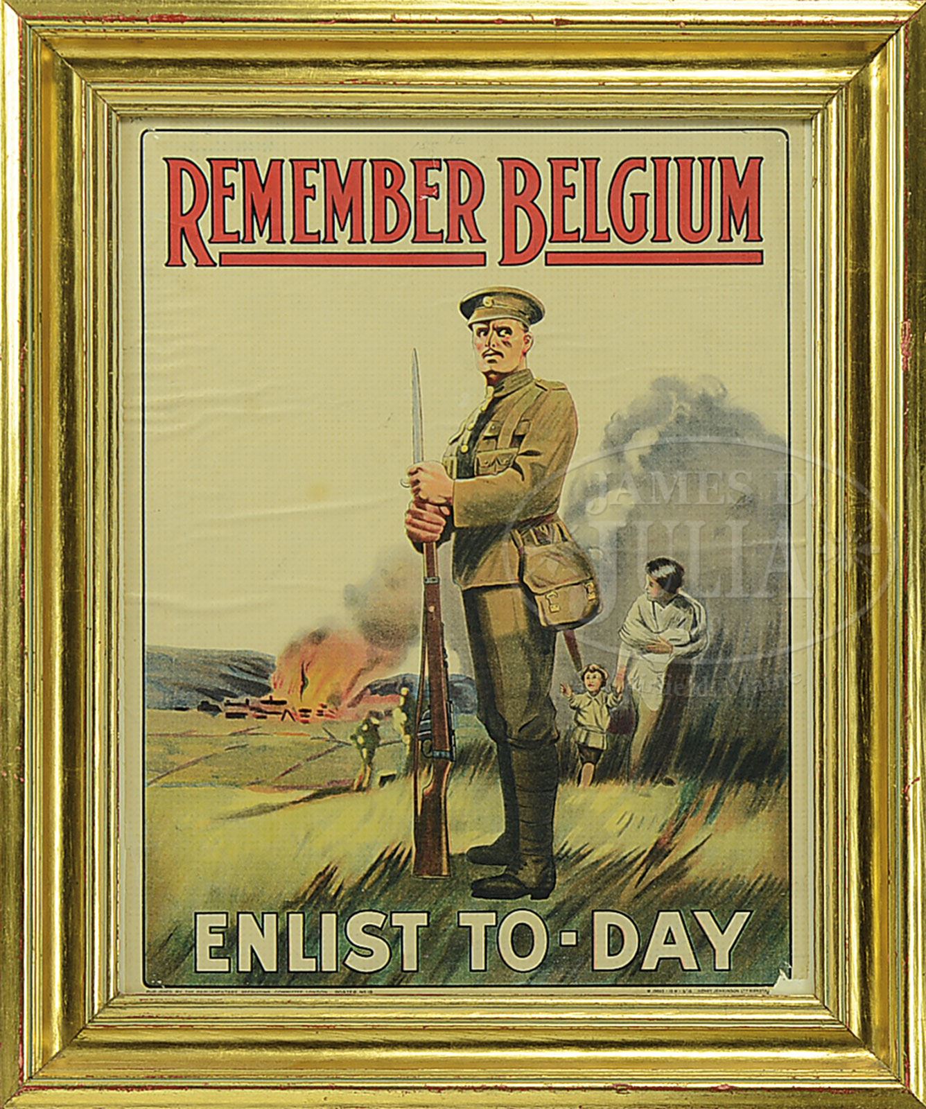LOT OF 7 WWI AND WWII MILITARY POSTERS.1) WWI English recruitment poster captioned “There is Room For You – Enlist Today”, with image of new recruits boarding a train bound for action. Lithographed by Wm. Strain & Sons LTD, London. 2) Artist portrayal of Hitler, Mussolini, and Hirohito captioned “Enemy Ears are Listening”. U.S. Government printing office 1942. 3) Photo likeness of Japanese Marshal Admiral Yamamoto being quoted as saying “I am looking forward to dictating peace to the United States in the White House at Washington”. 4) WWI poster of the campaign to elevate Boy Scouts up from the ranks to become Scoutmasters. Published by Boy Scouts of America, 200 Fifth Ave., New York. 5) British WWI recruiting poster caption “Remember Belgium – Enlist To-day”. Image of a British Army soldier standing on a knoll with a Belgium village burning in the distance. 6) WWII 1942 Joe Louis poster with the former heavy weight boxing champion saying “We’re going to do our part…and we’ll win because we’re on God’s side”. 7) WWI Victory Liberty Loan with a woman draped in the Stars and Stripes by noted American artist Howard Chandler Christy, 1919. SIZE: Image: 19″ w x 29″ h. 2) Image: 25″ w x 13″ h. 3) Image: 13″ w x 19″ h. 4) Image: 26″ w x 39-1/2″ h. 5) Image: 15″ w x 19″ h. 6) Image: 13-3/4″ w x 19-1/2″ h. 7) Image: 26-1/4″ w x 39-3/4″ h. PROVENANCE: The Collection of Richard J. Miller. CONDITION: 1) Near excellent. 2) Near excellent. 3) Near excellent. 4) Near excellent. 5) Good; has a few horizontal ripple; paper loss bottom right corner; two inch vertical tear at top. 6) Very good to excellent. 7) Good to very good; multiple horizontal ripples; diagonal fold at top. 1-14950 (1,000-1,500) – Lot 1713 Auction: Advertising, Toy & Doll Auction - Fall 2014 Please Note: All prices include the hammer price plus the buyer’s premium, which is paid by the buyer as part of the purchase price. The prices noted here after the auction are considered unofficial and do not become official until after the 46th day. |