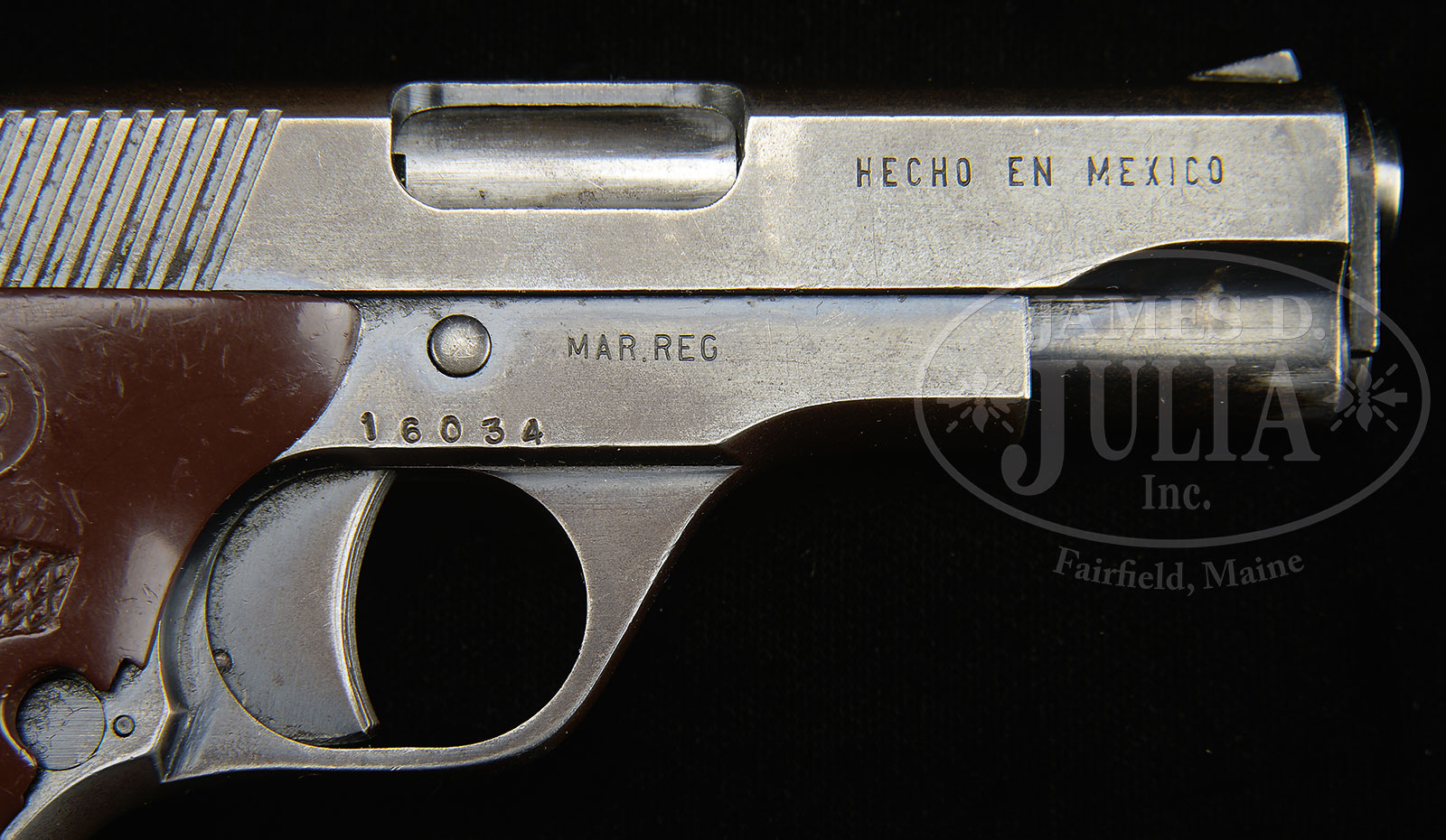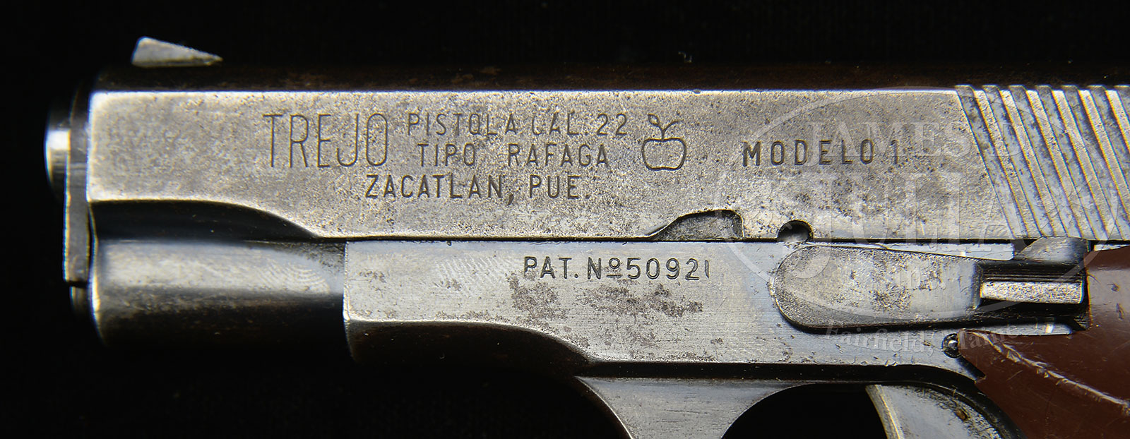 **TREJO MODEL 1 – THE WORLD’S SMALLEST MACHINE GUN.SN 16034. Cal. .22 LR. 3″ bbl. This really cool .22 pistol is actually select fire with the selector on the right side. Marked on left side of slide with makers marking, Apple logo and model. Patent number on left side of frame, on right side of slide “HECHO EN MEXICO” with SN on right side of frame. Safety is on left side a simple rotating switch which interrupts the hammer when cocked. This lot includes six model 1-A parts kits without frames, with a total of seven mags included in this lot. Six mags are marked Trejo with Apple logo, seventh mag is unmarked and part of a .22 Llama parts kit which fits just fine into the Trejo. Firing mechanism moves smoothly when operated by hand, this weapon appears fully functional. This is a National Firearms Act item and requires BATF approval prior to transfer. This weapon is fully transferable on an ATF form 3 or form 4. CONDITION: Overall appearance and finish is very good. Quality manufactured with a lustrous blue finish turning to an even gray patina with some light pitting on left side of slide, left side of frame and slide catch, with finish thinning on hand grip. Hard brown plastic grips have numerous scuffs and handling marks, right grip panel is cracked at lower retention screw. Bore is excellent, shiny, and bright. Mags run from the best having about 90% finish to the worst having about 30% with a gray/brown patina. The various parts kits range about the same, with the grip sets without any thumb ridge being in somewhat better condition. No doubt this is going to be a fast firing and fun little rig. 51154-1 JWK718 (5,000-10,000) – Lot 1714