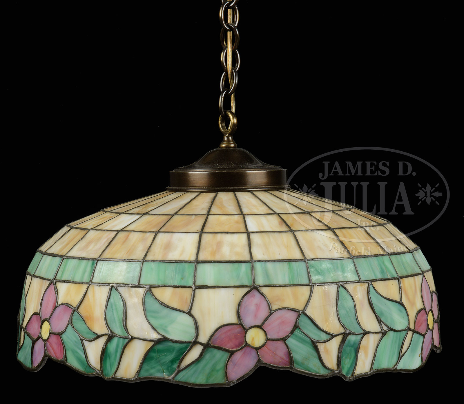 AMERICAN LEADED GLASS HANGING LAMP.American leaded glass hanger has leaded floral border with pink flowers and striated green glass leaves surrounding the irregular border, set against a caramel slag background. A green slag geometric band encircles the shoulder of the shade giving way to the geometric caramel slag background. Fixture is complete with original metal hardware finished in rich brown. Unsigned. SIZE: Shade 18″ dia. 36″ from ceiling to bottom of shade. CONDITION: Very good to excellent. 52044-1 (600-900) – Lot 1716