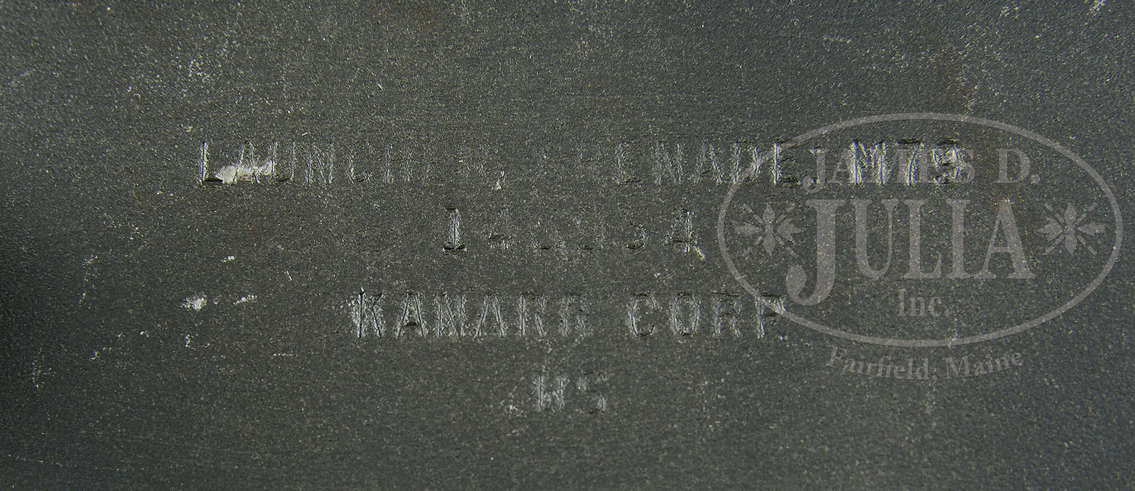 **DD ENTHUSIASTS GROUP OF KANARR CORPORATION M70 GRENADE LAUNCHER RECEIVERS (DESTRUCTIVE DEVICES).1) KANARR CORP M79. SN 55588. Cal. 40mm. NOTE: Each item will incur its own BATF transfer tax if transferred on a form 4. Bbl not applicable. Extremely fine M79 grenade launcher, lower assembly only, with trigger guard which swivels to either the right or the left when spring loaded latch is depressed. Marked on underside “LAUNCHER, GRENADE M79” followed by SN and then “KANARR CORP. / US” added in both hand stamp “DWD M79 001 DIX JAX FL”. Also in dot punched at bottom of receiver “DWD-M-79-001”. Firing mechanism appears to be in good working order. Although registered as Destructive Device, without the bbls these are nothing more than Title I receivers. This will transfer as Destructive Device on ATF Form 3 or Form 4. This is a National Firearms Act item and requires BATF approval prior to transfer. PROVENANCE: From the Estate Collection of Noted Discerning Firearms Enthusiast, Donald W. Dix, Jr. CONDITION: Overall appearance and finish near excellent as refinished over light pitting with a grey Parkerized matte finish. Composite buttstock with recoil pad near excellent. Consignor states that if bbl is found among estate items in future, it will be forwarded to Julia’s for conveyance to buyer. NFA 2) KANARR CORP M79. SN 147454. Cal. 40mm. Bbl not applicable. Extremely fine M79 grenade launcher, lower assembly only, with trigger guard which swivels to either the right or the left when spring loaded latch is depressed. Marked on underside “LAUNCHER, GRENADE: M79” followed by SN and then “KANARR CORP. / US”. Firing mechanism appears to be in good working order. Although registered as Destructive Device, without the bbls these are nothing more than Title I receivers. This will transfer as Destructive Device on ATF Form 3 or Form 4. This is a National Firearms Act item and requires BATF approval prior to transfer. PROVENANCE: From the Estate Collection of Noted Discerning Firearms Enthusiast, Donald W. Dix, Jr. CONDITION: Overall appearance and finish near excellent as refinished over light pitting with a grey Parkerized matte finish. Composite buttstock with recoil pad near excellent. Consignor states that if bbl is found among estate items in future, it will be forwarded to Julia’s for conveyance to buyer. NFA 3) KANARR CORP M79. SN 146954. Cal. 40mm. Bbl not applicable. Extremely fine M79 grenade launcher, lower assembly only, with trigger guard which swivels to either the right or the left when spring loaded latch is depressed. Marked on underside “LAUNCHER, GRENADE; M79” followed by SN and then “KANARR CORP. / US”. There is a discernible hand etched number “29-304” within the inside lower part of the receiver. Firing mechanism appears to be in good working order. Although registered as Destructive Device, without the bbls these are nothing more than Title I receivers. This will transfer as Destructive Device on ATF Form 3 or Form 4. This is a National Firearms Act item and requires BATF approval prior to transfer. PROVENANCE: From the Estate Collection of Noted Discerning Firearms Enthusiast, Donald W. Dix, Jr. CONDITION: Overall appearance and finish near excellent as matte refinish over fine bead blasting with a grey Parkerized matte finish. Composite buttstock with recoil pad near excellent. Consignor states that if bbl is found among estate items in future, it will be forwarded to Julia’s for conveyance to buyer. NFA 4) KANARR CORP M79. SN 151301. Cal. 40mm. Bbl not applicable. Extremely fine M79 grenade launcher, lower assembly only, with trigger guard which swivels to either the right or the left when spring loaded latch is depressed. Marked on underside “LAUNCHER, GRENADE: M79” followed by SN and then “KANARR CORP. / US”. Firing mechanism appears to be in good working order. Although registered as Destructive Device, without the bbls these are nothing more than Title I receivers. This will transfer as Destructive Device on ATF Form 3 or Form 4. This is a National Firearms Act item and requires BATF approval prior to transfer. PROVENANCE: From the Estate Collection of Noted Discerning Firearms Enthusiast, Donald W. Dix, Jr. CONDITION: Overall appearance and finish near excellent as refinished over light pitting with a grey Parkerized matte finish. Composite buttstock has some scuffs and handling marks, recoil pad near excellent. There are noticeable gouges on the right side of the metal of the receiver and spring loaded button of the trigger guard detent which do not in anyway affect the functionality. Consignor states that if bbl is found among estate items in future, it will be forwarded to Julia’s for conveyance to buyer. NFA 51794-24, 51794-25, 51794-26, 51794-27 JWK (3,000-6,000) – Lot 1717