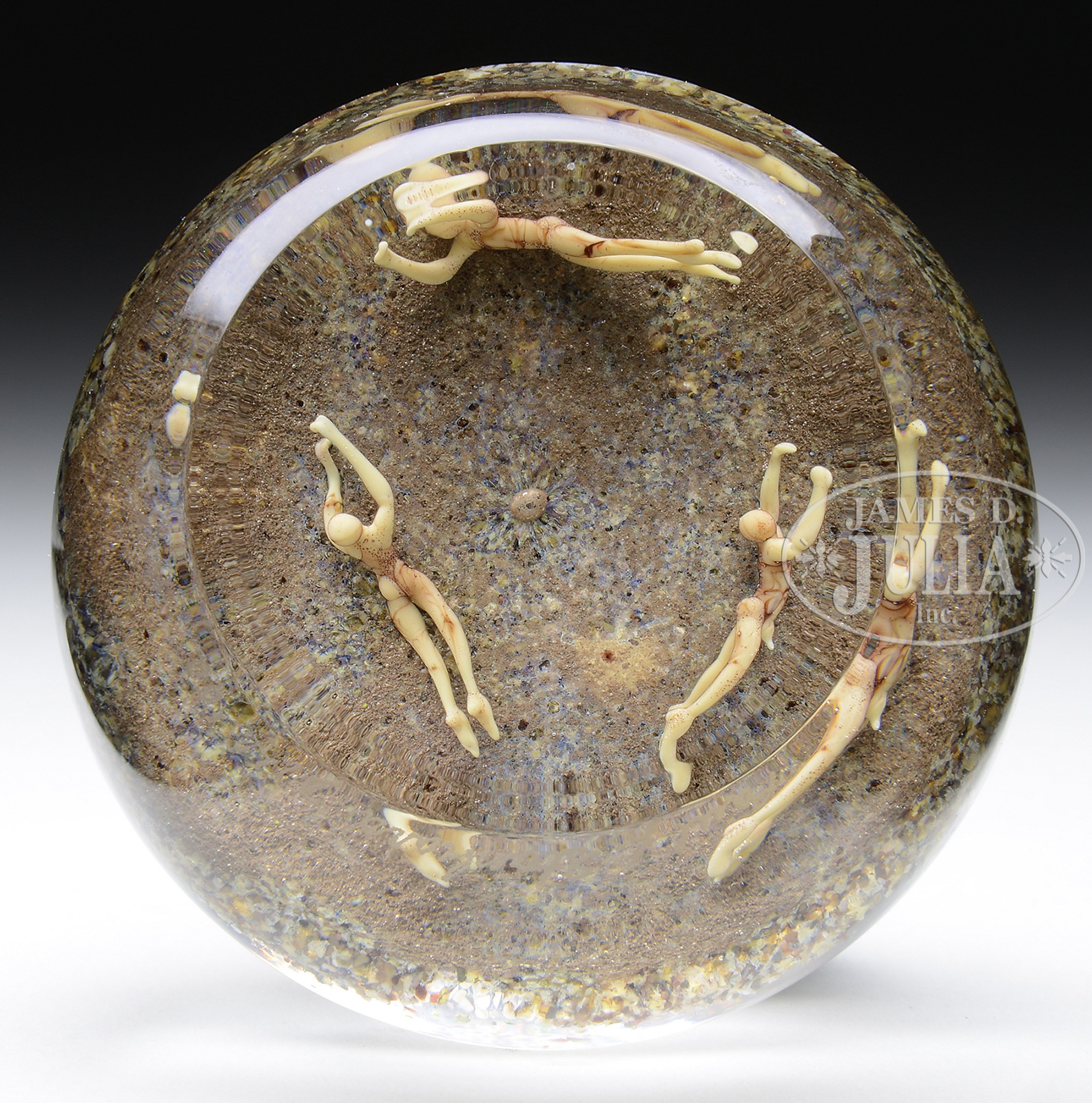 PAUL STANKARD FLORAL AND ROOT PEOPLE PAPERWEIGHT.Paul Stankard paperweight has white flowers and buds breaking through sandy soil on the top of the paperweight along with three root people figures surrounding the underside of the soil. Signed on the side near the foot “Paul J. Stankard D14 ’92”. SIZE: 3-1/4″ dia. CONDITION: Very good to excellent. 48966-45 (2,000-3,000) – Lot 1721