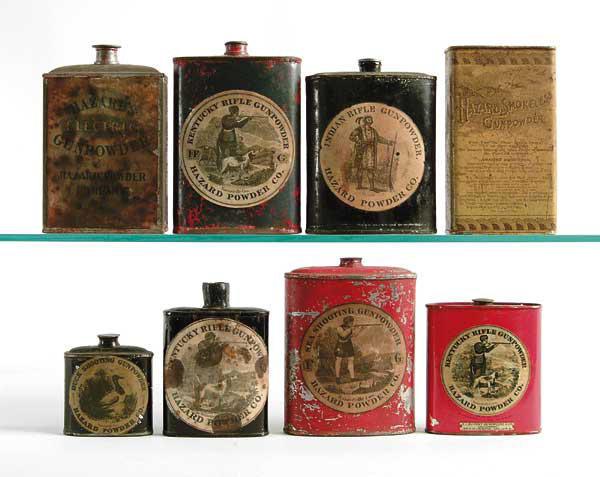 LARGE LOT OF 15 HAZARD POWDER TINS. Incl.: 1-lb Electric Gun Powder. – Most of red paint missing, label badly foxed and chipped. 1-lb Smokeless Yellow Label. – Paint badly chipped. Oval black 1-lb Indian Rifle Gun Powder. – Label good, most black paint missing. Another 80% black paint. 1-lb Oval Black Kentucky Rifle Powder. – Very good. 1-lb Red over Black Kentucky Rifle Gun Powder, different label. – Label fine most of red paint missing. Another Red can. – Missing stopper, label very dirty. Another Squat Black can. – Paint good, label poor. 1/2-lb Orange can. – Paint crackled. 2 more with DuPont over labels, one in Spanish. 1 1/4-lb Duck Shooting Powder. 1 1-lb Red Sea Shooting Powder. – Missing the stopper. 1/2-lb Black can Kentucky Rifle Powder, can is same size as label. – Spout has been replaced, label is badly stained. Plus 2 Red cans with partial labels. 4-47329-90 FS555 (300-500)