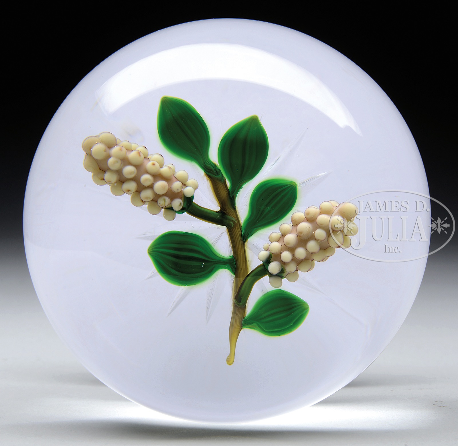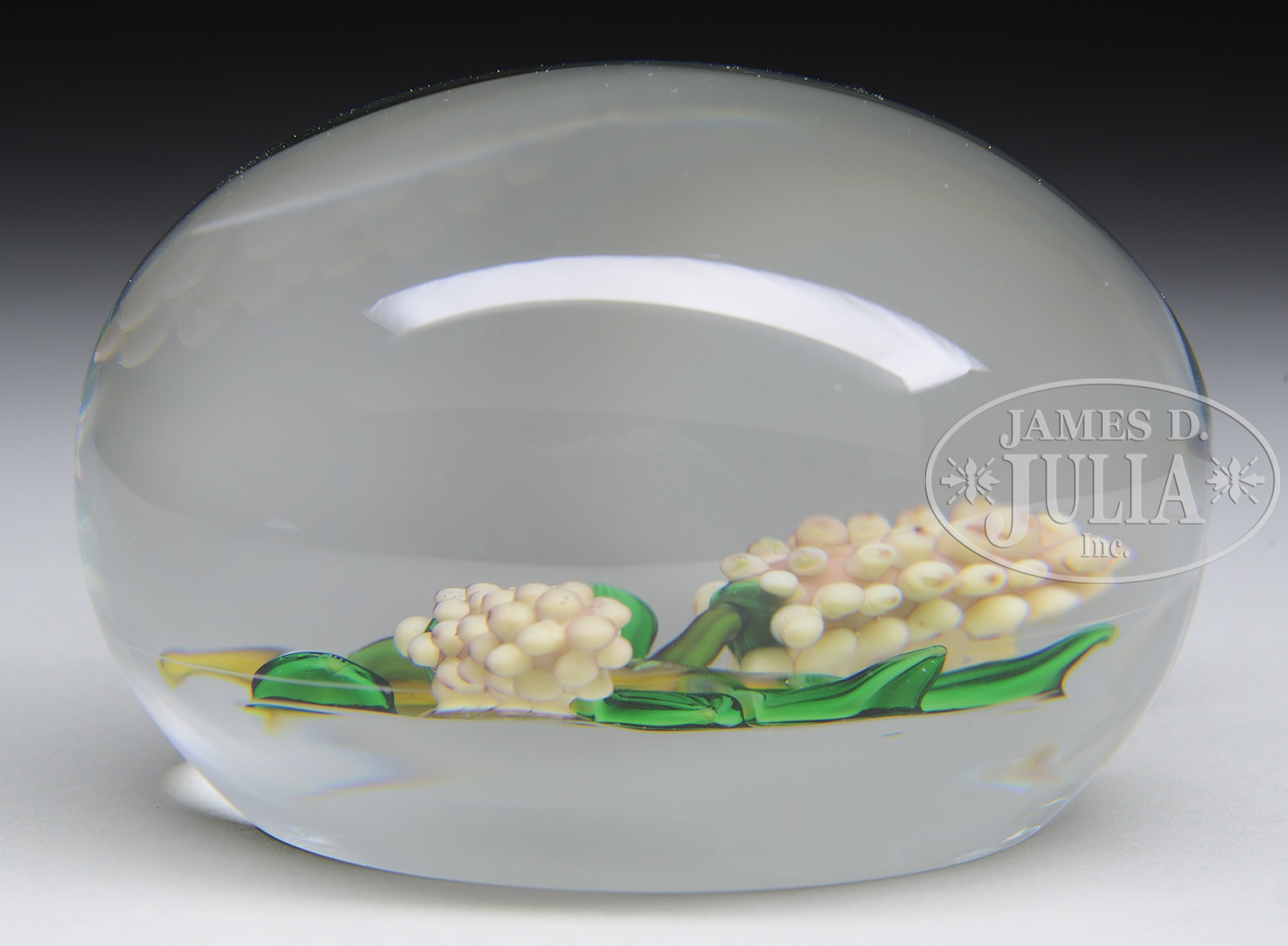 DELMO TARSITANO PAPERWEIGHT.Clear glass paperweight by Delmo Tarsitano is decorated with white stylized flowers with brown stems and green veined leaves. Paperweight is signed on the underside of one green leaf with white signature cane “DT”. SIZE: 3″ dia. CONDITION: Very good to excellent. 48966-69 (400-600) – Lot 1724