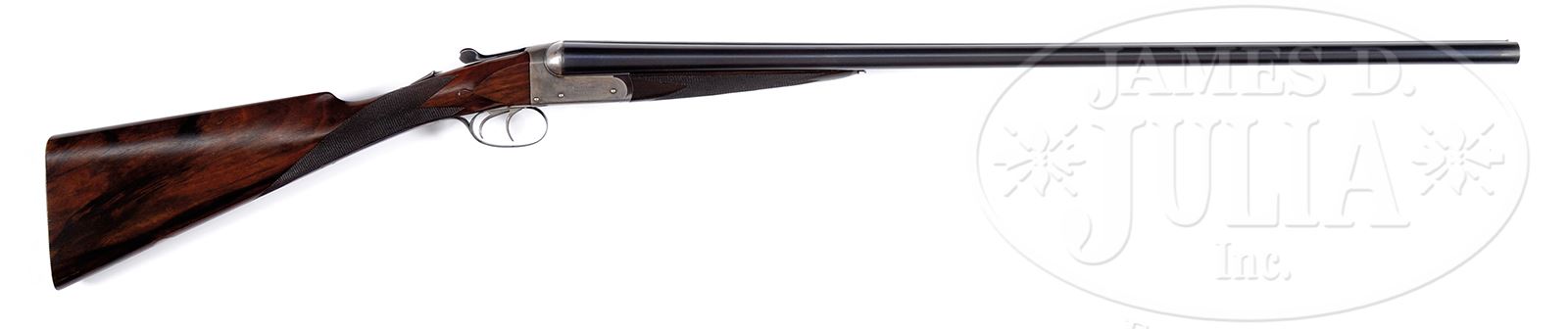 *WM. CASHMORE BOXLOCK 20 GAUGE GAME GUN.SN 13579. 29-1/16″ bbls, with 3-1/4″ chambers (extended to this length). Choked IMP CYL/FULL. Full length plain steel rib with steel front bead marked “WM. CASHMORE, MAKER, BIRMINGHAM” with light scroll. Double triggers, automatic ejectors, automatic safety, straight grip stock, checkered in two-point pattern with tear drop behind action and 14-1/8″ LOP over serrated lined checkered butt with silver oval. Splinter forearm with Curtis release nicely checkered in four-point pattern. Un-engraved receiver, marked “WM. CASHMORE” on both sides. Trigger plate and trigger guard are blued with engraved screws. WEIGHT: 5 lbs, 10 oz. CONDITION: Excellent. Bbls retain 95-97% orig blue with a couple of light handling marks and scratches. Receiver retains 85-90% case color starting to lighten. Trigger plate and trigger guard retain most of what could be their orig blue. Buttstock and forearm are excellent with minor handling marks, and retain most of orig hand-rubbed varnish. Mechanics are excellent. Bores are bright and shiny. A dandy little gun. 49417-62 JSL205 C&R (3,000-5,000) – Lot 1727