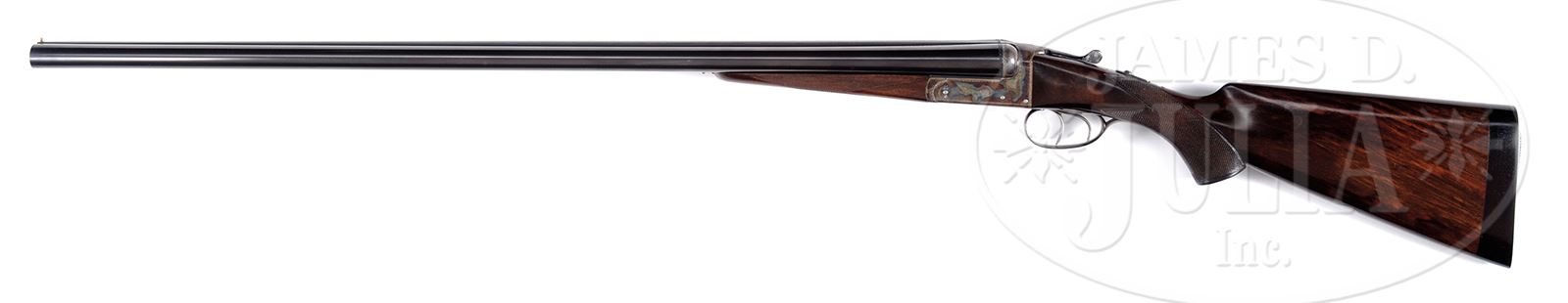 *WILLIAM POWELL BOXLOCK GAME GUN.SN 16065. 12 ga. 31-3/4″ bbls. 2-3/4″ chambers. A full set of choke tubes accompany this gun. Double triggers, extractors, non automatic safety. Full pistol grip buttstock checkered in 2-pt pattern with 14-15/16″ LOP over large 1″ darkened wood checkered butt extension. Silver oval in stock. Splinter forend with Curtis push button release checkered in 3-pt pattern. Frame is nicely border engraved and marked “William Powell & Son” on both right and left side. Floor plate is blued and also border engraved. WEIGHT: 7 lbs. 12 oz. CONDITION: Extremely fine as refurbished. Bbls retain most of a restored rust blued finish with a couple of light handling marks. Receiver and forend iron retain most of their professionally restored case colors. Top lever and trigger guard retain most of their restored blued finish, trigger guard starting to tone at tang. Buttstock and forearm are excellent and retain most of their custom restored finishes with a few light scratches and handling marks. Bores are bright and shiny. Mechanics are excellent. 49459-1 JSL280 C&R (2,500-4,500) – Lot 1728