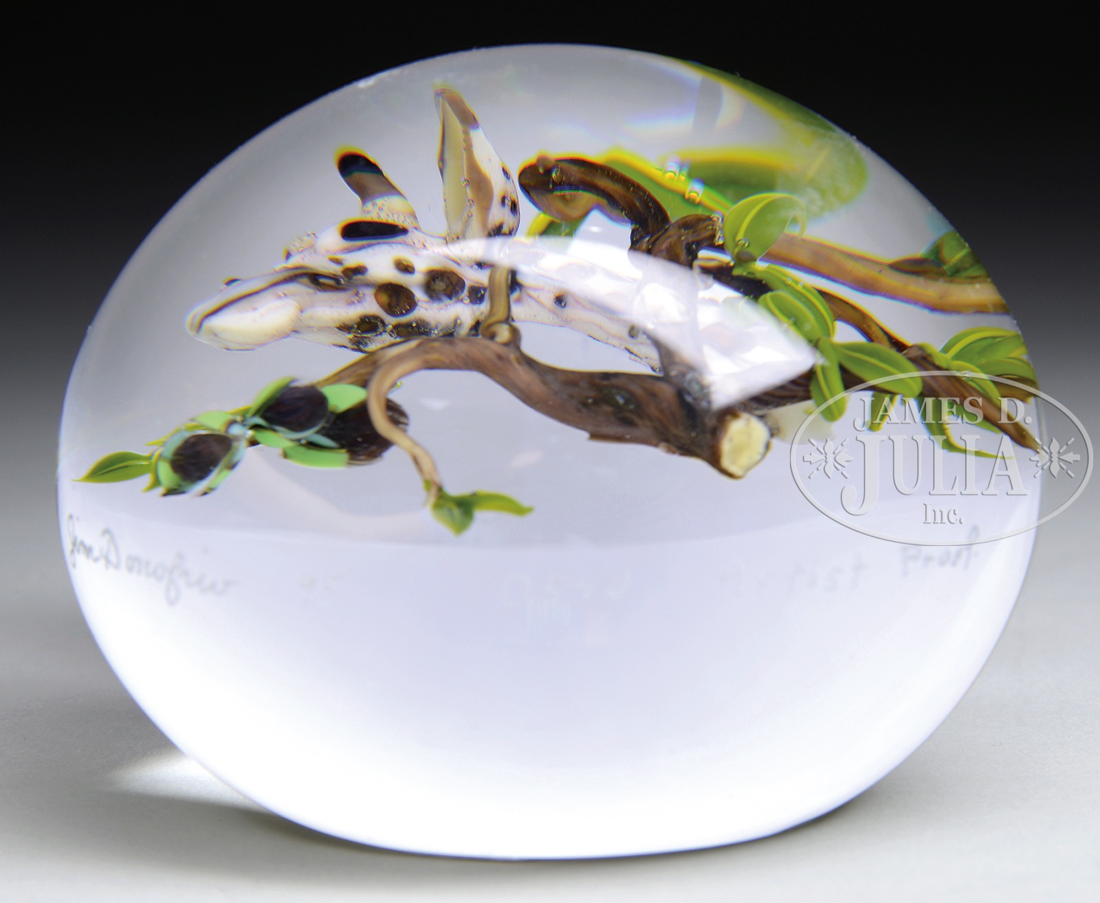JIM D’ONOFRIO GIRAFFE PAPERWEIGHT.Paperweight by Jim D’Onofrio features a giraffe’s neck and head within a spray of tree limbs, leaves and flowers. Signed on the side with etched signature “Jim D’Onofrio 950540 Artist Proof”. SIZE: 3-1/2″ dia. CONDITION: Very good to excellent. 48966-57 (800-1,200) – Lot 1729