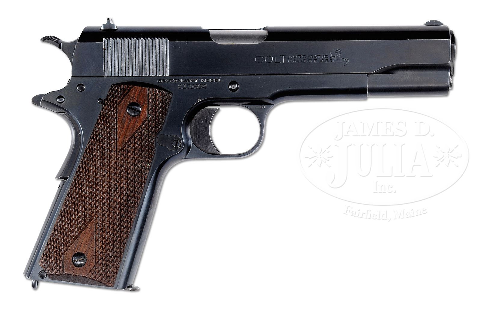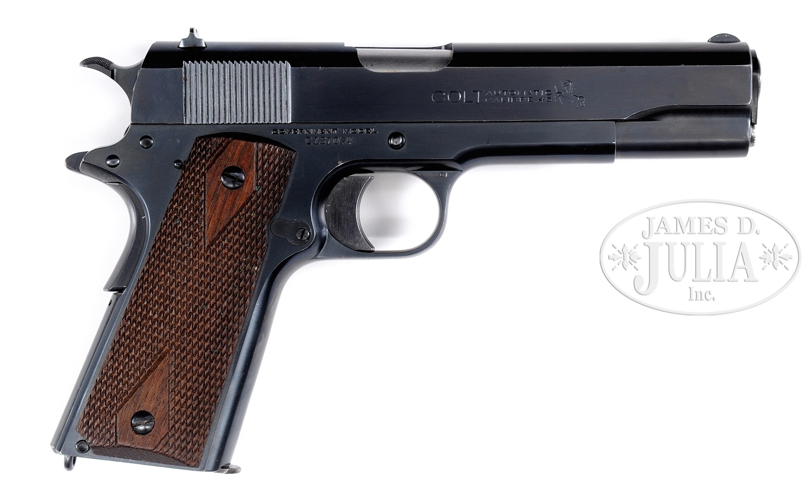 *COLT 1911 GOVERNMENT MODEL PISTOL CIVILIAN ISSUE IN REPRO BOX.SN C131074. Cal. 45 ACP. 5″ bbl, blue finish, checkered walnut grips. Maroon-colored reproduction box has Colt label on inside of lid, blue end label, no number on bottom. PROVENANCE: Larry Baer Estate Collection. CONDITION: Very fine. Slide retains 95% blue with slight muzzle wear and a few small scratches near ejector port. Very little high point wear. Bore is frosty with visible rifling. Frame retains 95% blue finish with a slight scratch by takedown pin, and slight fading on mainspring housing. Hammer and trigger retain 95% blue with slight scratches, correct magazine, grips are fine with sharp checkering and very few mars. Box is very good. A very nice early Commercial M “1911”. 50206-1 TEP C&R (2,000-3,000) – Lot 1733
